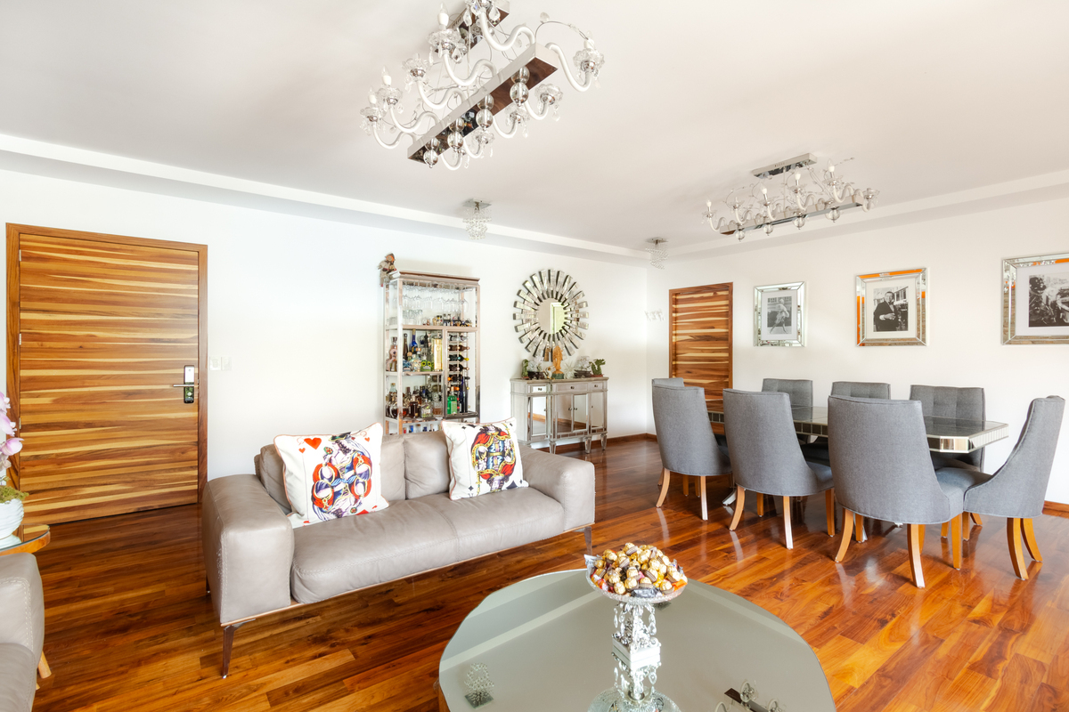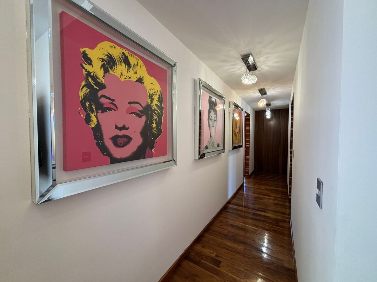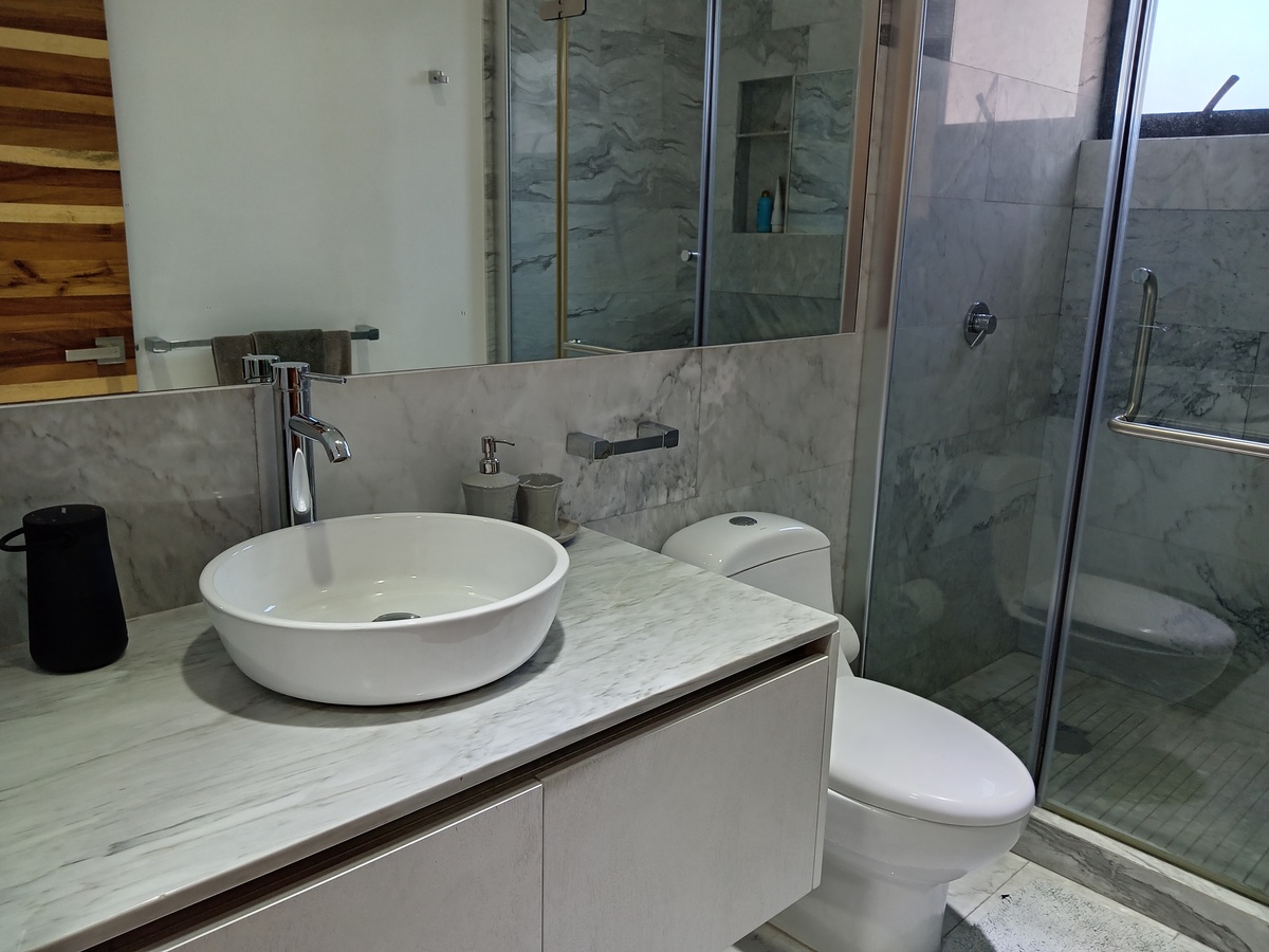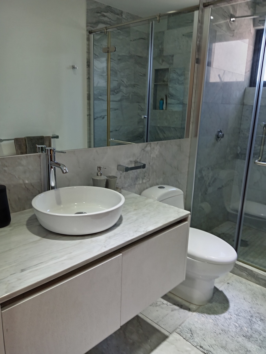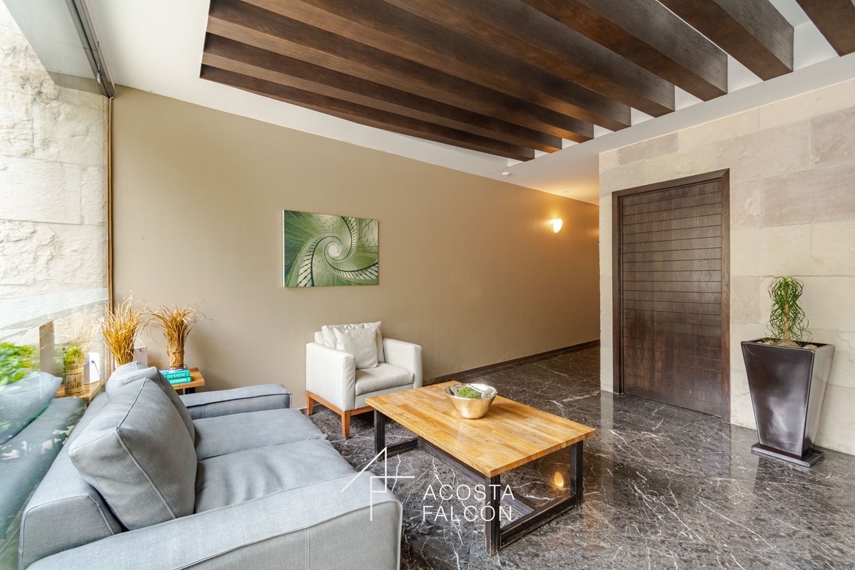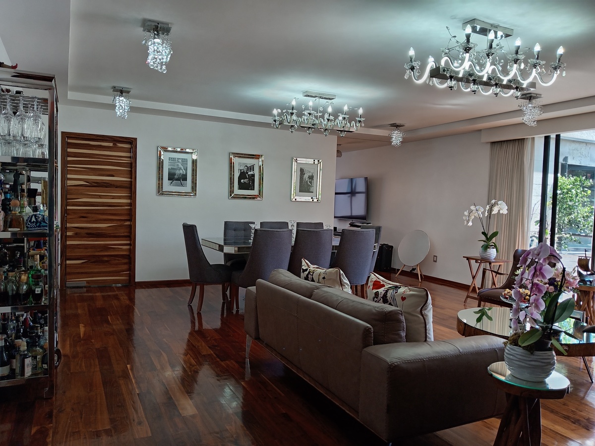 El departamento tiene hermosa luz natural, techos altos, sala amplia a un costado pared forrada de piedra, tiene ventanas corredizas de piso a techo con acceso a balcon, comedor, cocina cerrada con barra de granito, baño de visitas, recámara principal con walking clóset, balcón y baño, 2 recámaras secundarias cada uno con baño y clóset, sala de televisión, cuarto de servicio con puerta de acceso independiente, área de lavado y secado, una bodega de 8m2, y dos estacionamientos techados.