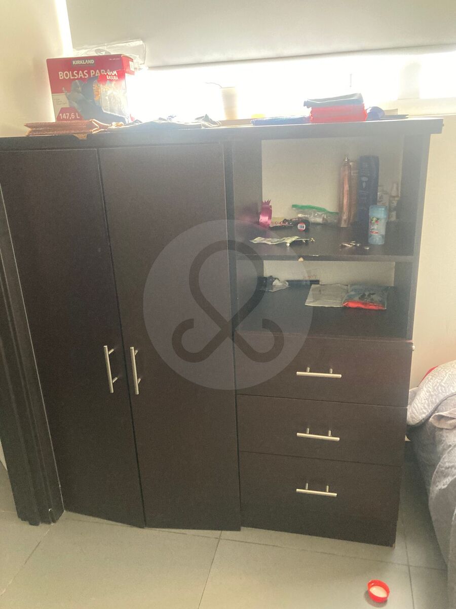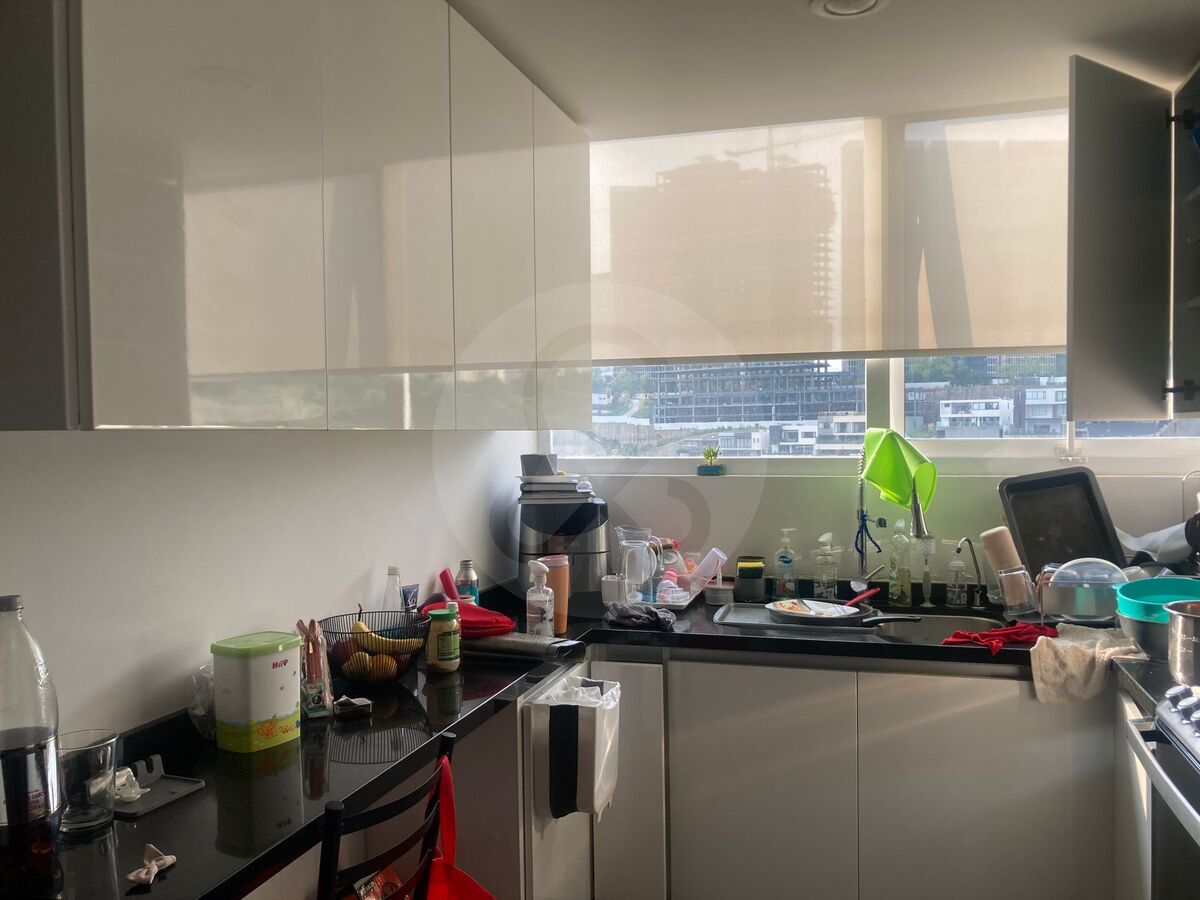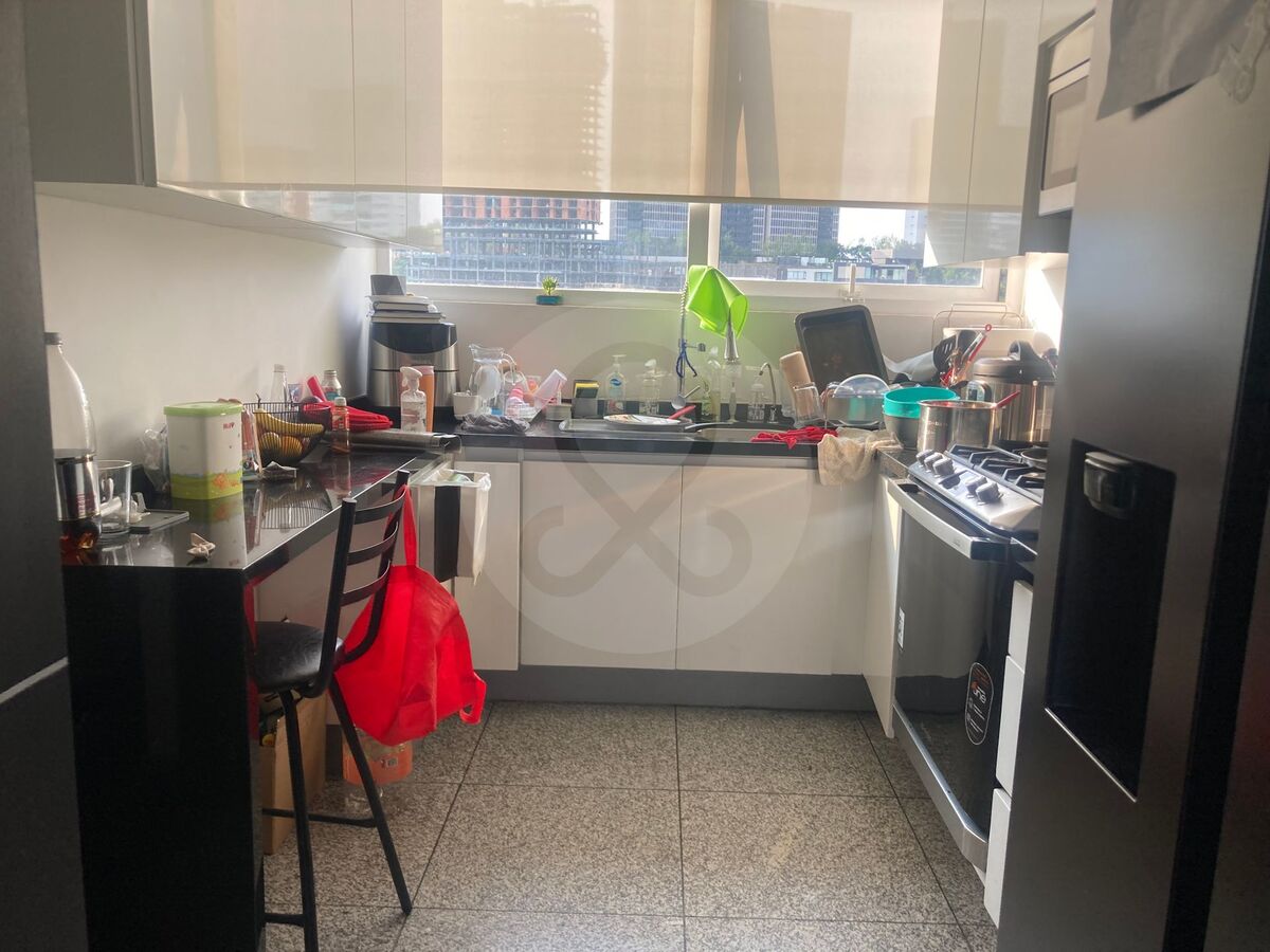 Cuenta con una cocina cerrada e integral con cubierta de granito y espacio suficiente para guardar