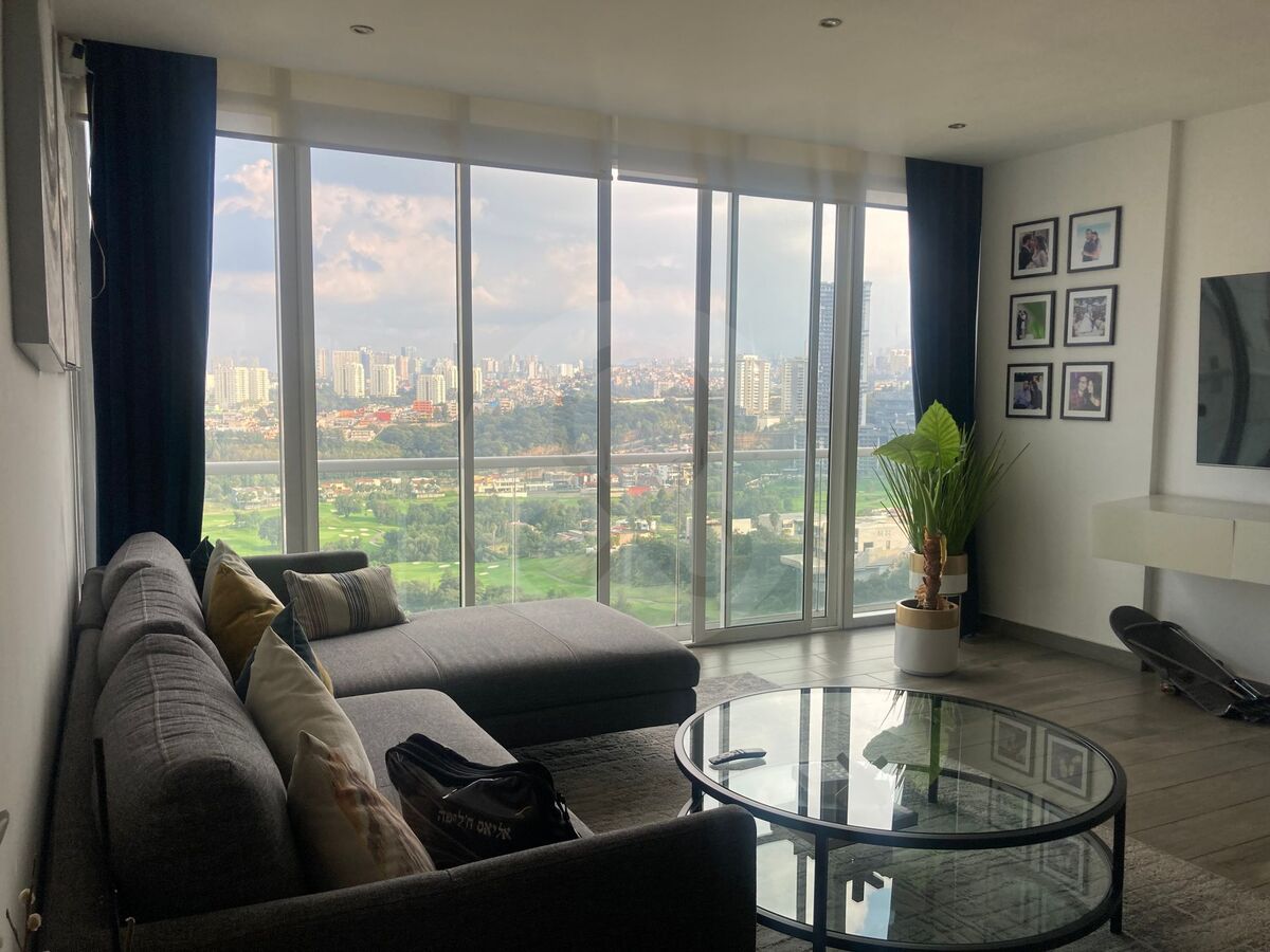 Una sala con un pequeño balcón y de donde se aprecia una vista a la ciudad y al campo de golf .