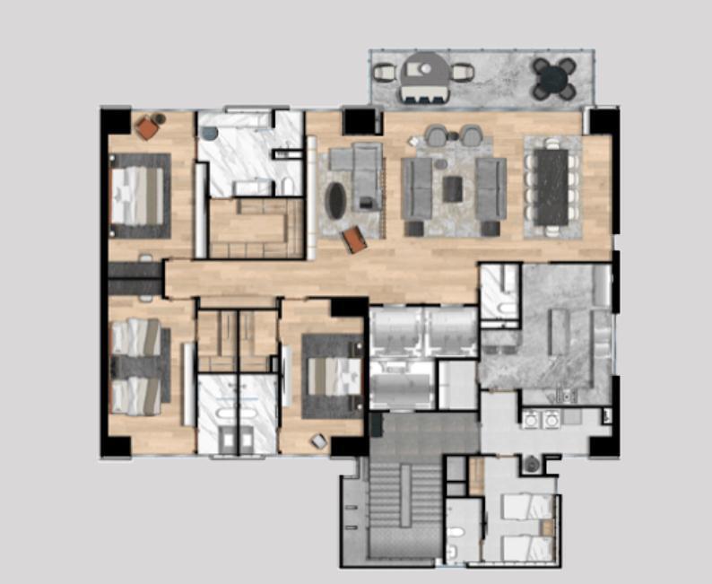 Consta de 248m2, gran sala comedor, excelente terraza con vista al golf de Lomas Country. Medio baño de visitas.