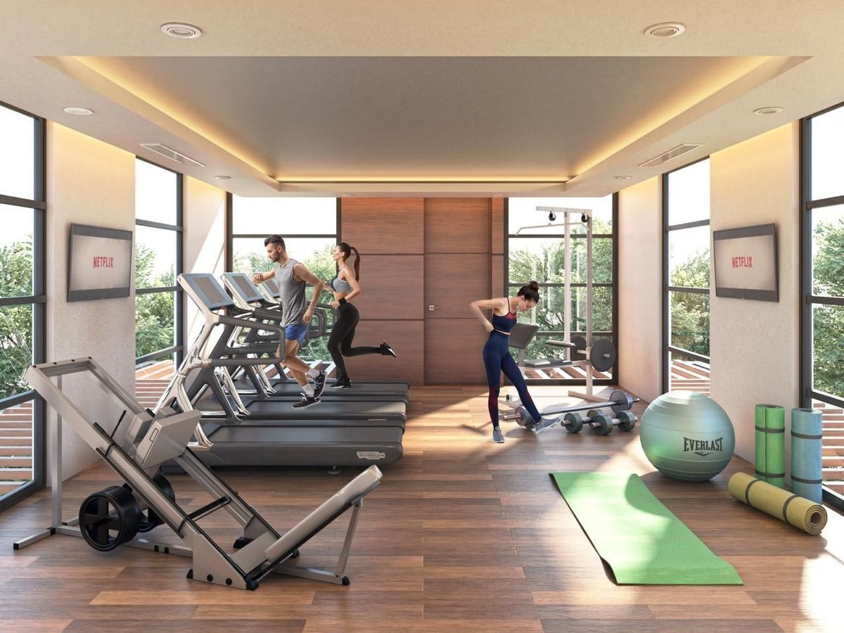 Pluma de acceso controlada, estacionamiento en áreas comunes, área arbolada con juegos infantiles, cancha de jogging, dos áreas de bar grill, gimnasio equipado, alberca con canal de nado, área de asoleadero con camastros, parque de
