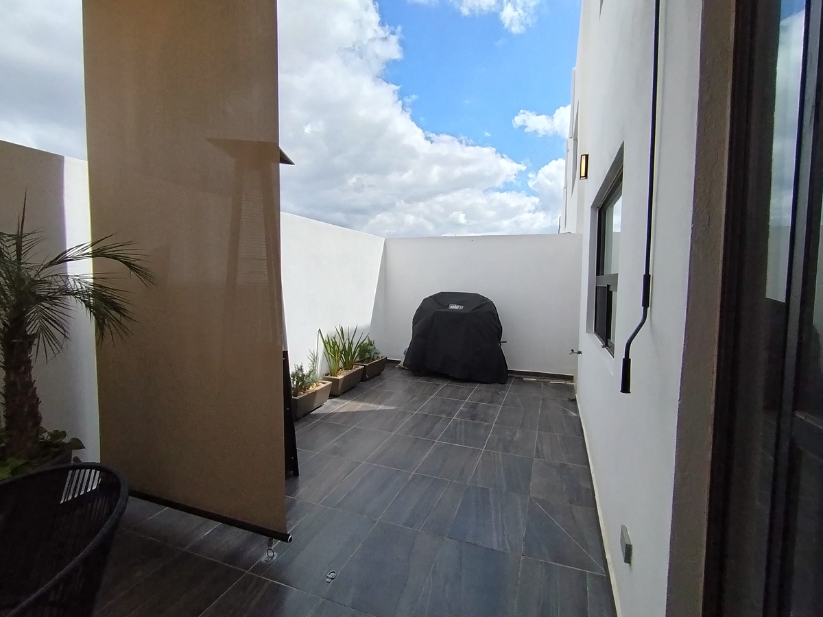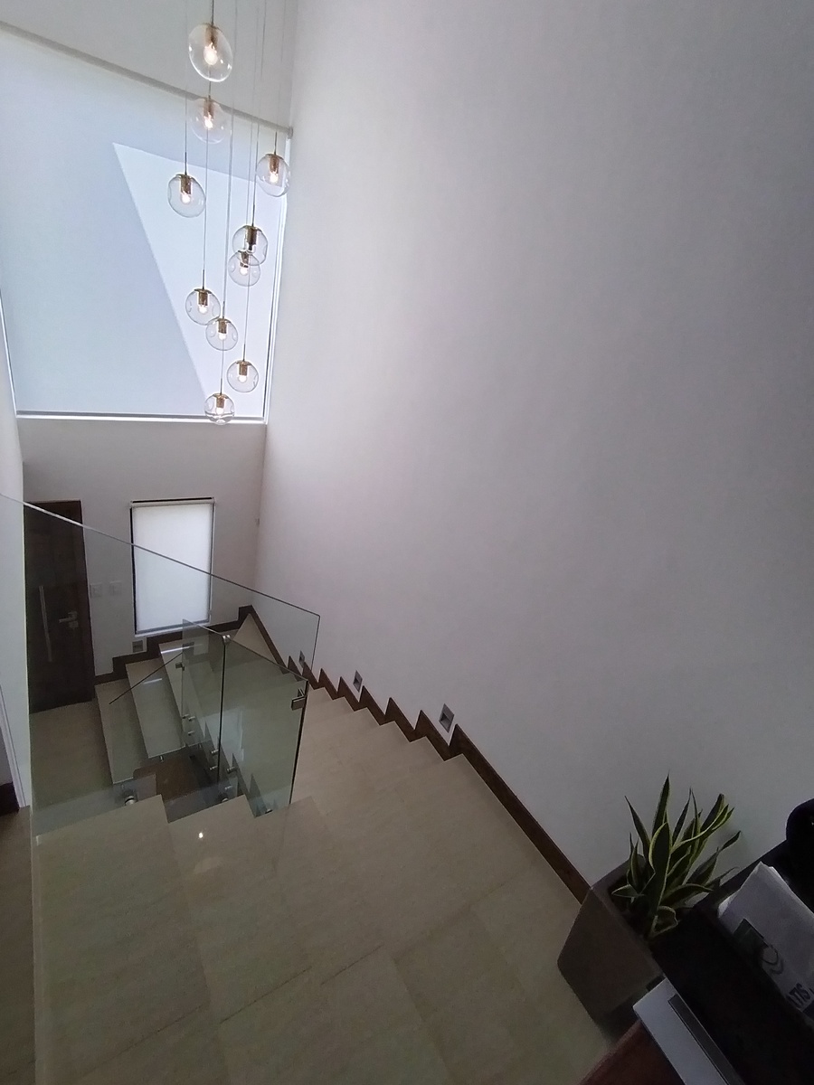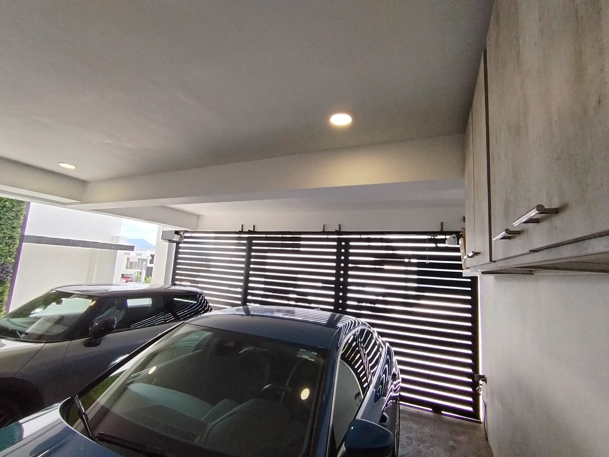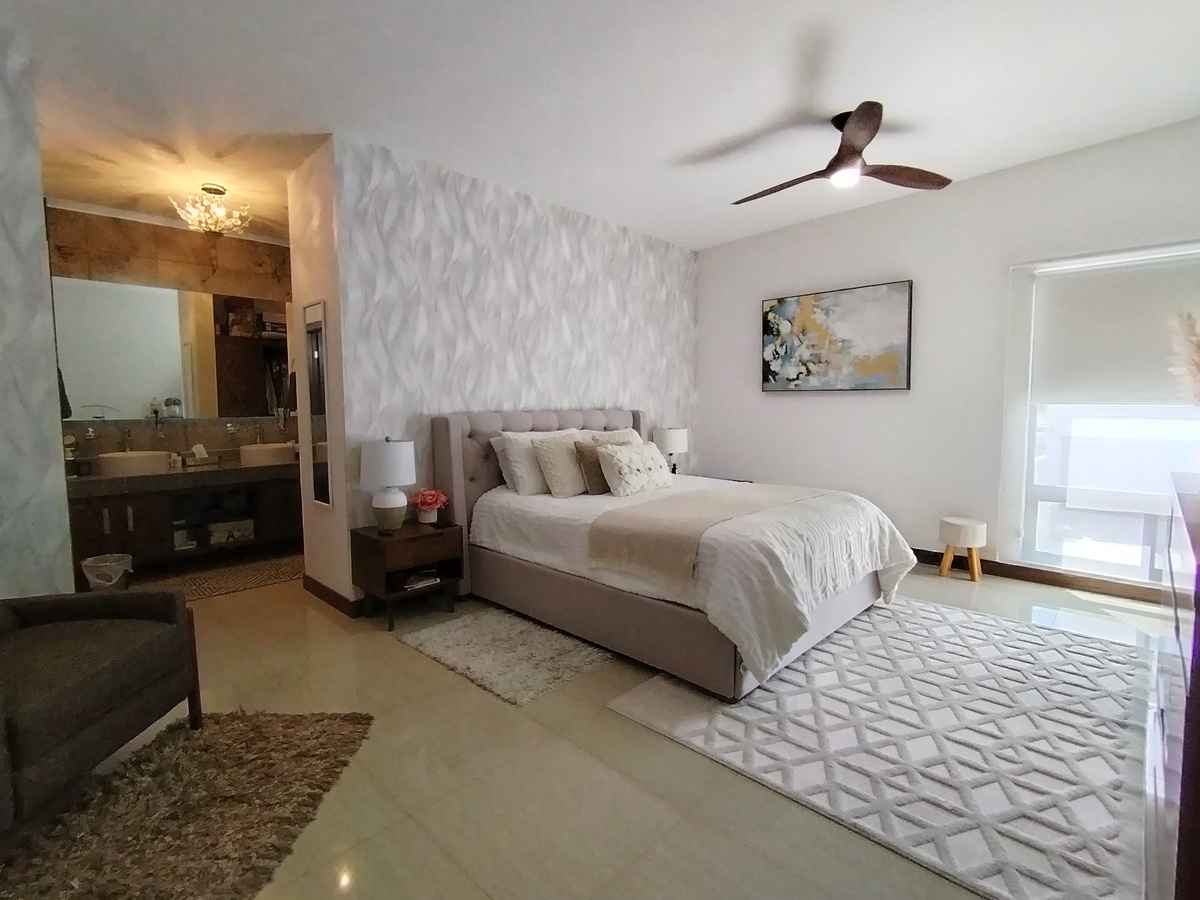 Equipada, cocina con granito, closet, vidrio templado en escalera y baños, herrería, clima, cisterna, portón eléctrico, vigilancia las 24 hrs., tapices, cisterna.