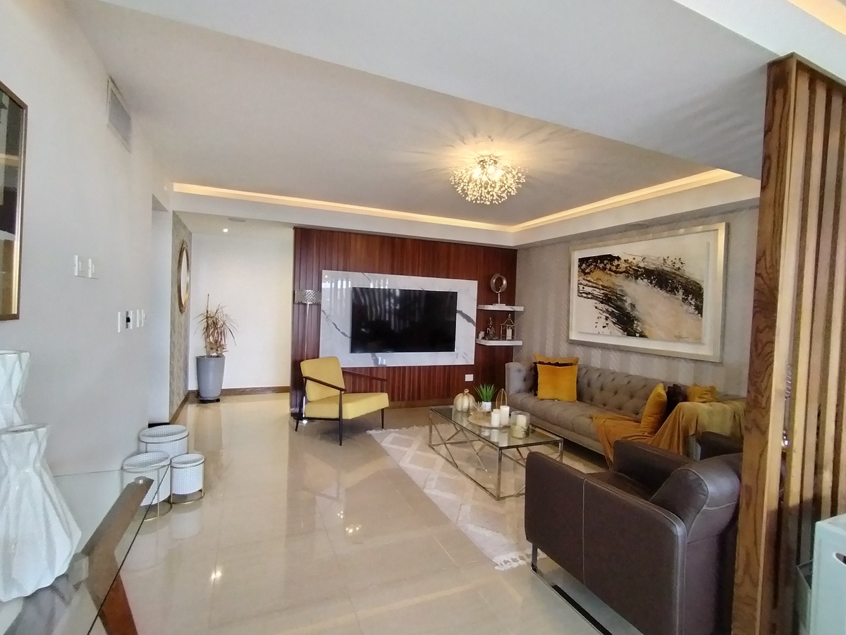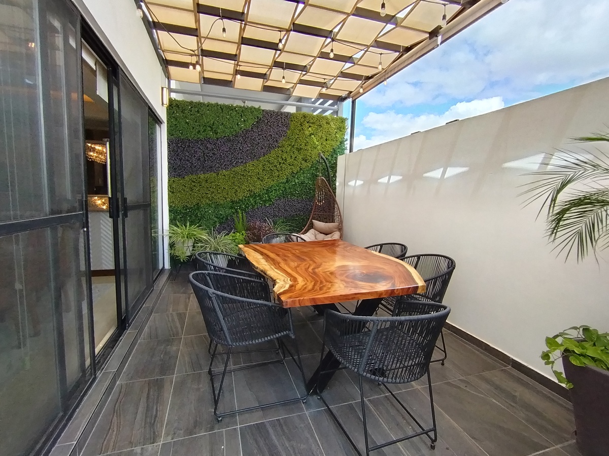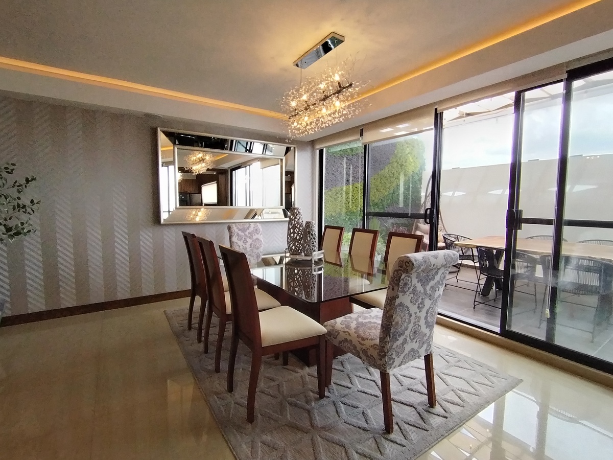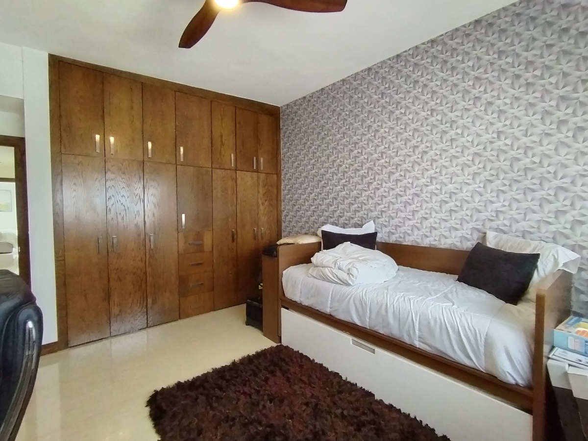 Equipada, cocina con granito, closet, vidrio templado en escalera y baños, herrería, clima, cisterna, portón eléctrico, vigilancia las 24 hrs., tapices, cisterna.