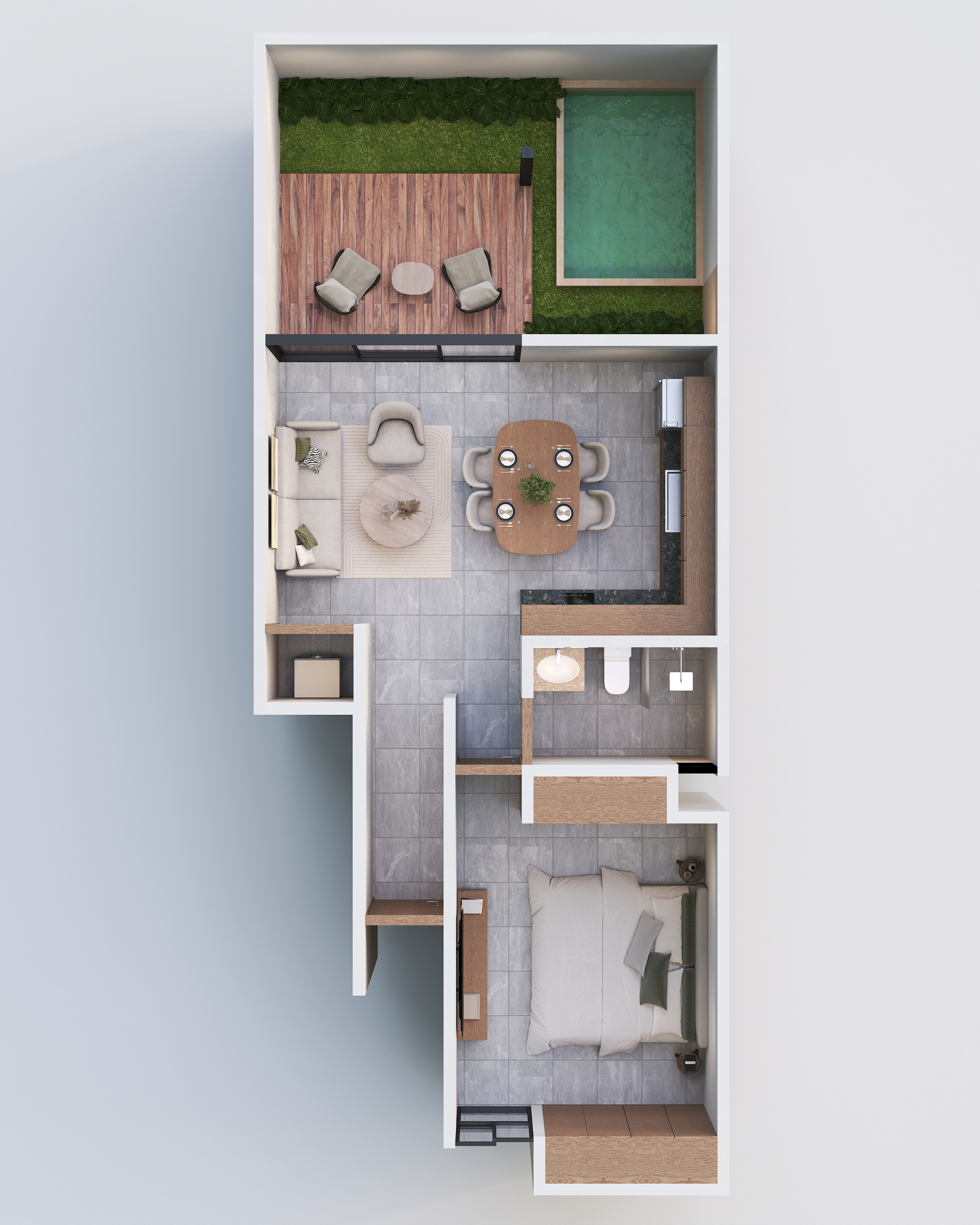 Departamento en Planta Baja, Modelo B (versión de 2 recámaras), diseñado para ofrecer espacios sociales integrados, terraza y piscina privada. Unidad lista para entrega en abril 2027, ideal como vivienda principal o inversión por su ubicación en la zona norte de Mérida y las amenidades del conjunto.
