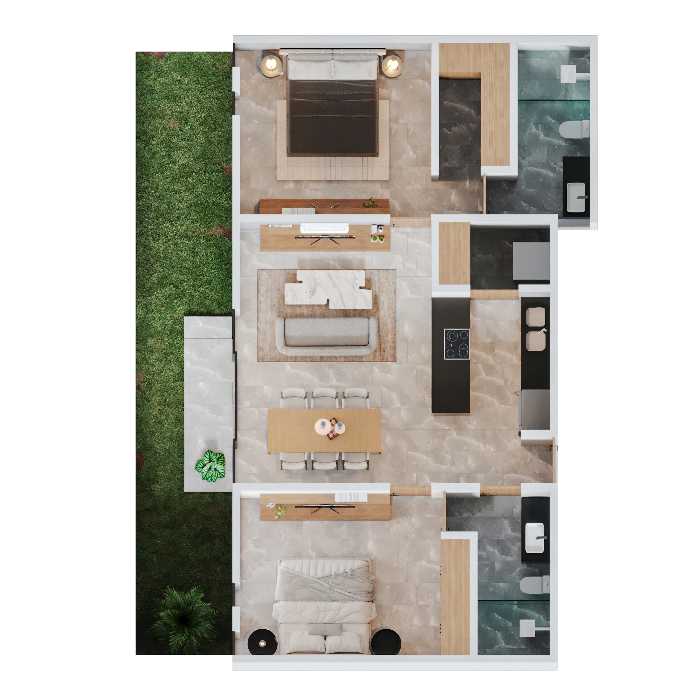 Departamento modelo Garde ubicado en planta baja en desarrollo ubicado dentro de Temozón Norte. Unidad de 2 recámaras, con terraza y jardín privado, ideal para quienes buscan amplitud, privacidad y conexión con áreas verdes.