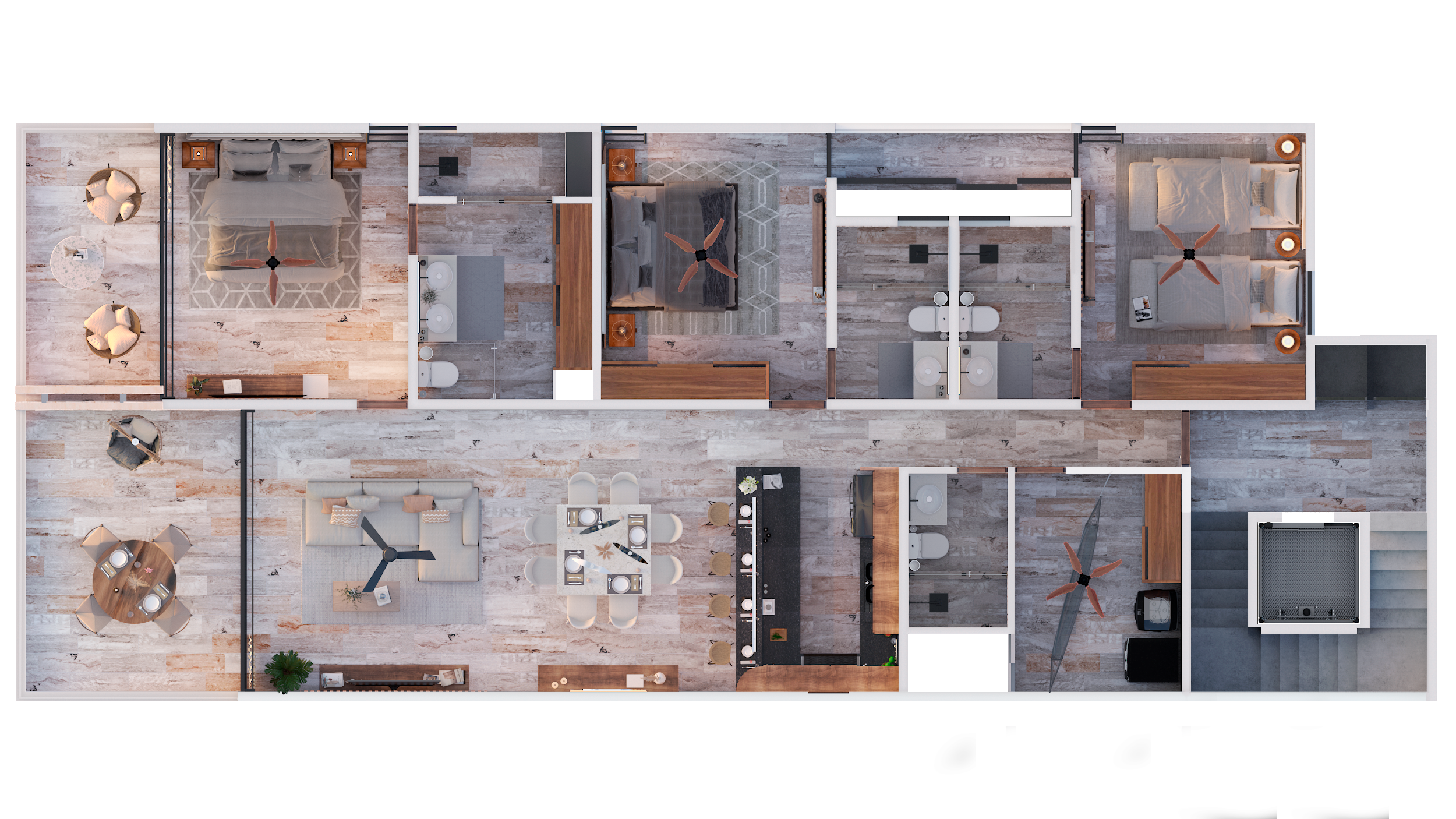 -2 recámaras con closet, baños completos independientes y balcón compartido.