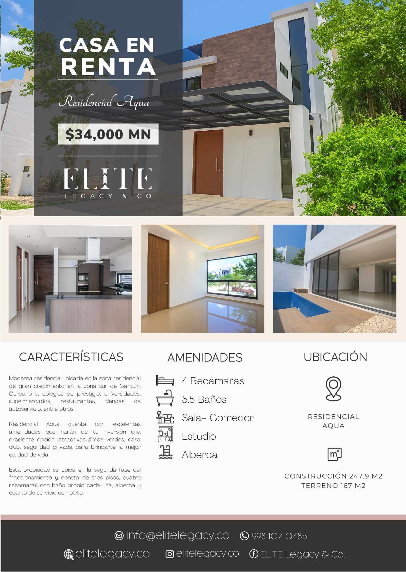 Esta propiedad se ubica en la segunda fase del fraccionamiento y consta de tres pisos, cuatro recamaras con baño propio cada una, alberca y cuarto de servicio completo.