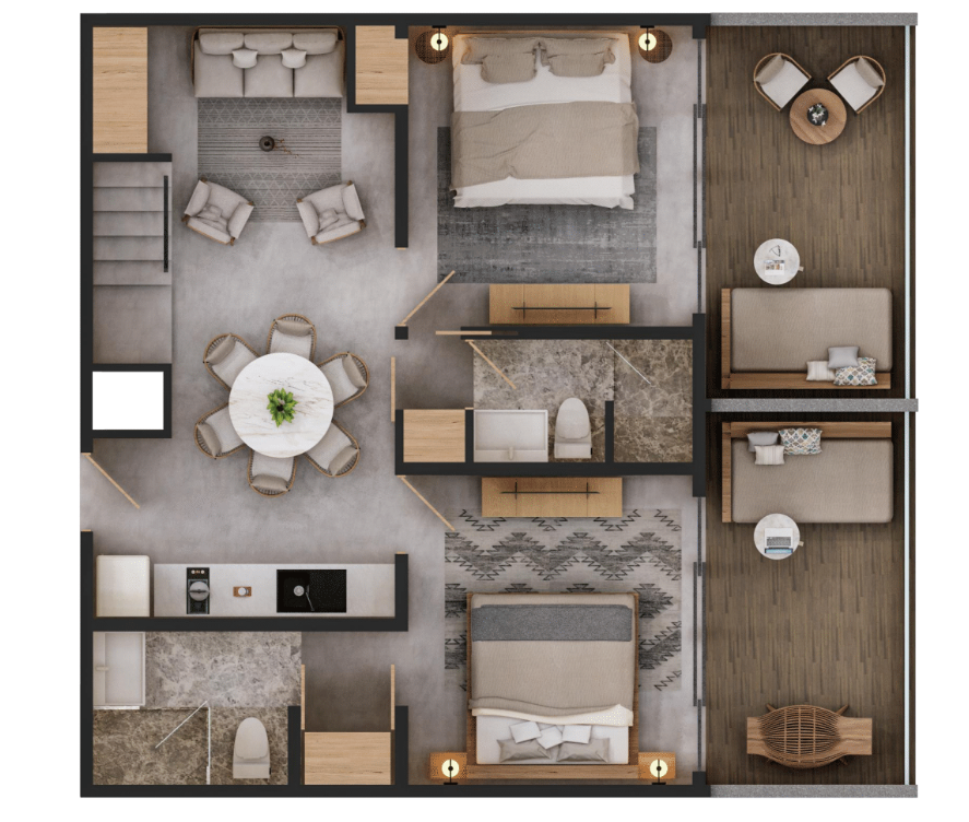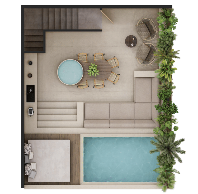 - Os móveis e decorações são mostrados para fins ilustrativos e não estão incluídos no preço.Exclusivo Penthouse en Grand Aston Alquimia Tulum, una residencia de lujo que combina diseño contemporáneo, privacidad absoluta y un estilo de vida tipo resort. Este penthouse de 143.60 m² ofrece un nivel principal con 2 recámaras con terrazas privadas, amplios clósets, 2 baños completos, cocina equipada de concepto abierto, comedor y una sala de estar luminosa con acceso directo a la terraza. En el rooftop, este hogar eleva la experiencia con una amplia terraza de 59.10 m², que integra alberca privada, camastros, área de comedor al aire libre y una práctica cocineta ideal para disfrutar atardeceres, cenas íntimas o reuniones con amigos.