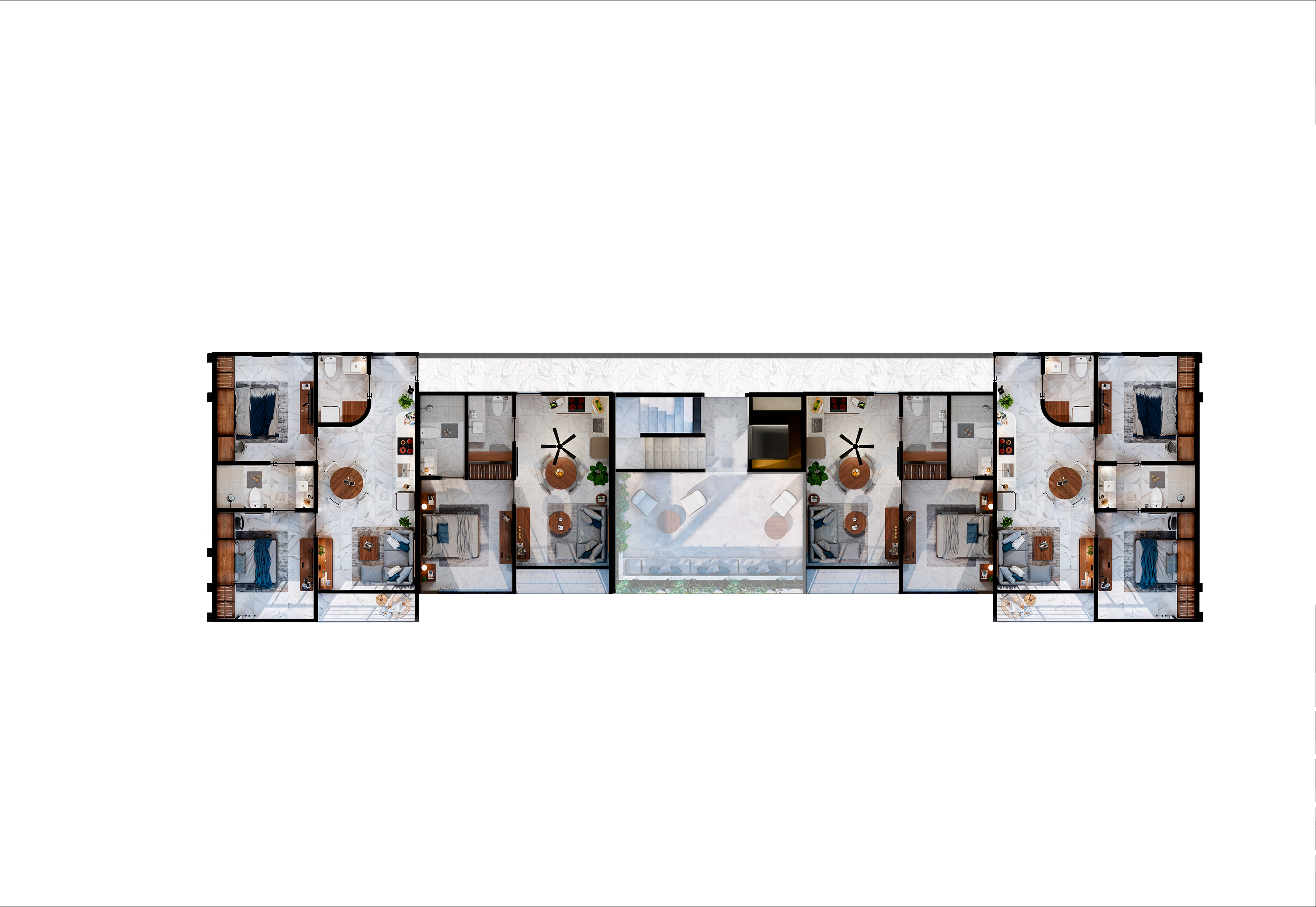 Em um terreno de 1.080,66m2, estão sendo construídos 21 apartamentos distribuídos em 6 níveis com 3 modelos diferentes.