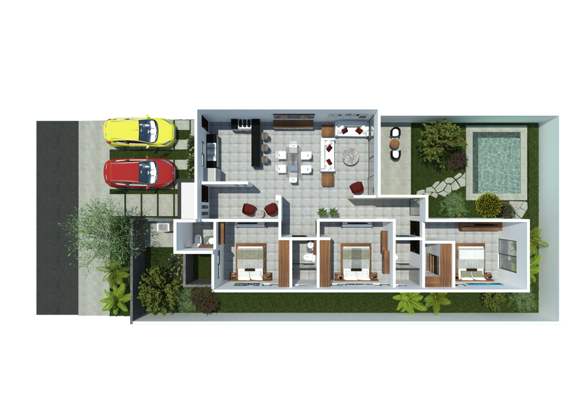 * Este é um render que pode variar em relação ao resultado real.*Casa de una planta con piscina en privada