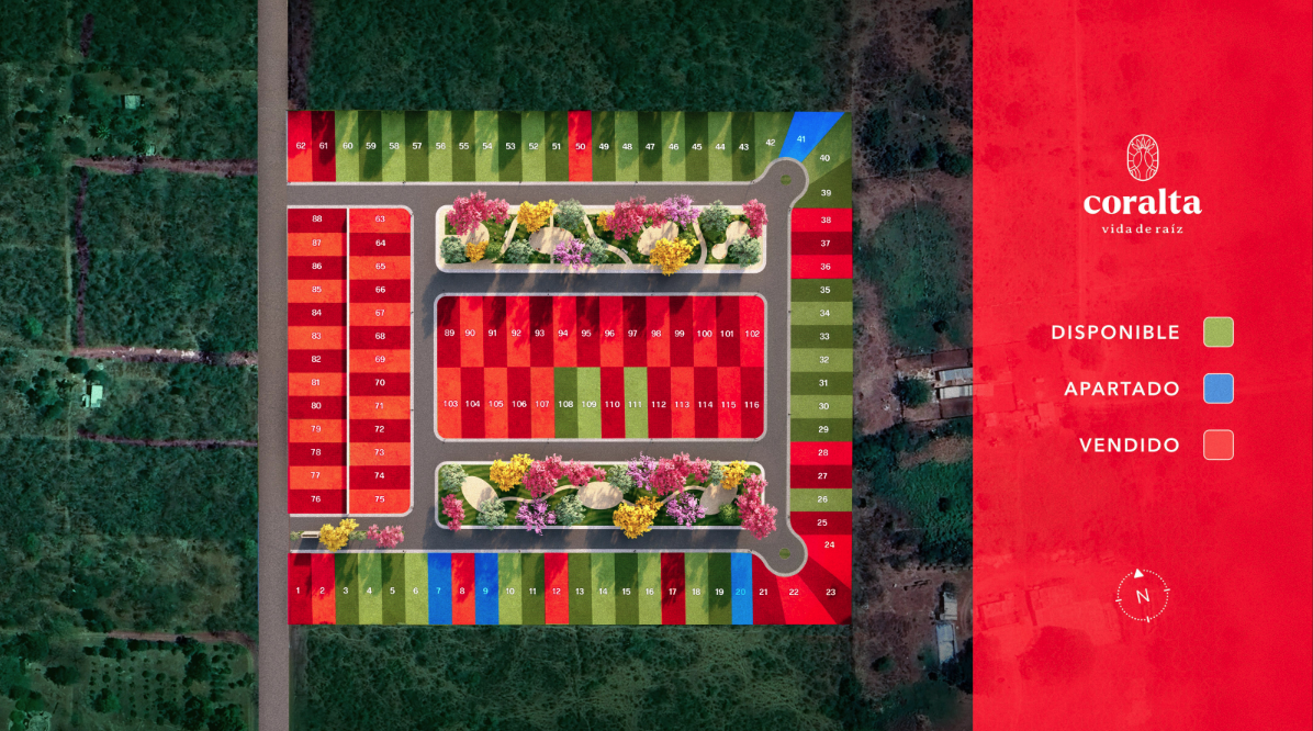 Coralta é um desenvolvimento urbanizado ao norte de Mérida com 116 lotes variando de 256m2 a 351m2.