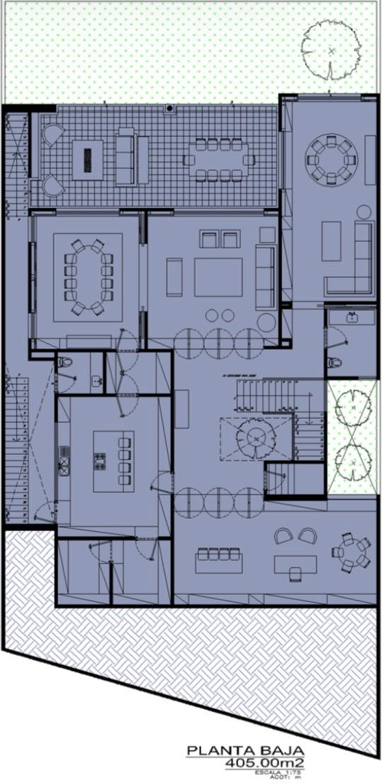 Desde el acceso principal, un vestíbulo da la bienvenida y conduce a un espectacular patio central de doble altura que articula visual y funcionalmente la planta baja. En este nivel se integran la sala y el comedor, ideales para el entretenimiento, así como un family room que aporta comodidad al día a día. La residencia cuenta con un despacho con bar, perfecto para trabajo o reuniones privadas, además de una amplia terraza y un jardín posterior y lateral que enmarcan los espacios sociales. La cocina, completamente equipada, dispone de despensa, área de vajillas y pantry, complementándose con toilette de visitas, baño para el jardín, bodega y patio lateral de servicio.