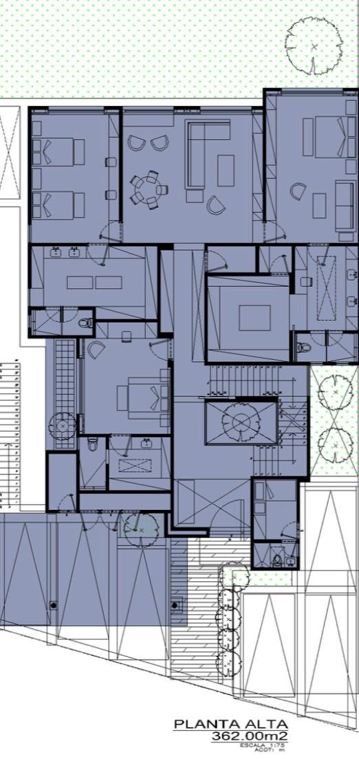 En la planta alta se encuentra el estacionamiento cubierto para seis vehículos, así como un vestíbulo con vista al patio central de doble altura que refuerza la sensación de amplitud. La recámara principal ofrece un ambiente exclusivo con sala privada, amplio baño con vestidor y cuarto de pánico, garantizando máximo confort y seguridad. Esta planta se completa con dos recámaras secundarias, ambas con baño completo y vestidor, una de ellas con salida directa a terraza, además de un family room, clóset de blancos, cuarto de servicio con baño completo, dos bodegas y cuarto de máquinas.