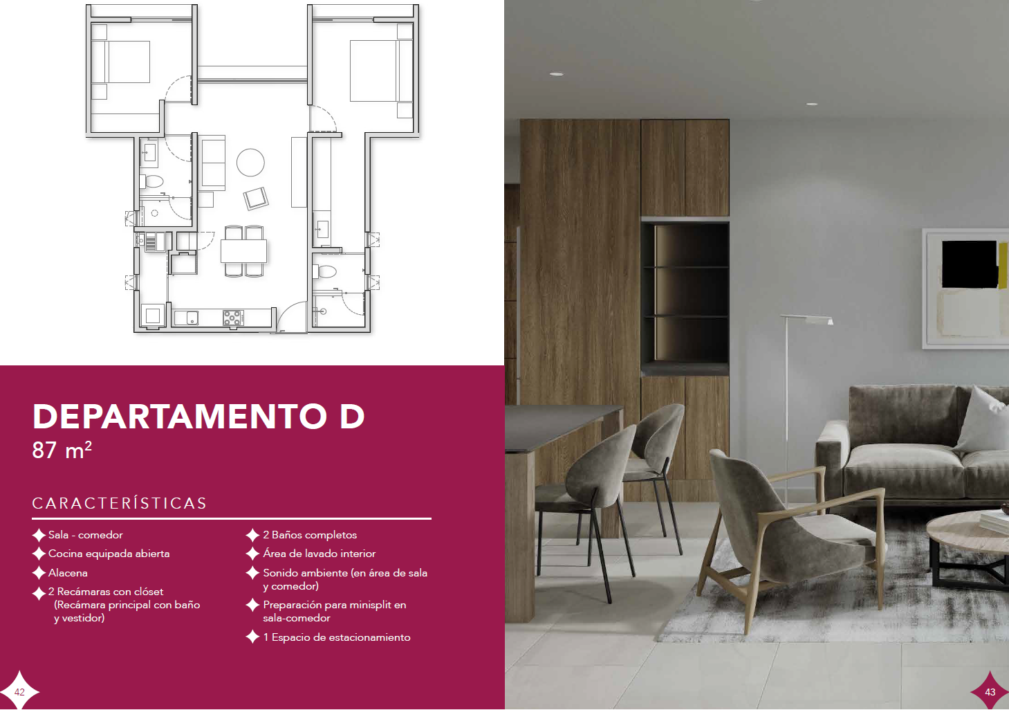 Departamento Modelo "D" con 87.87 m2 de superficie. Sala Comedor. Cocina equipada abierta. Alacena. 2 Recámaras con Clóset (Recámara Principal con Baño Completo y vestidor). 2 Baños completos, área de lavado interior. Sonido Ambiente en área de sala-comedor. Preparación para minisplit en sala-comedor. 1 espacios de estacionamiento privado.