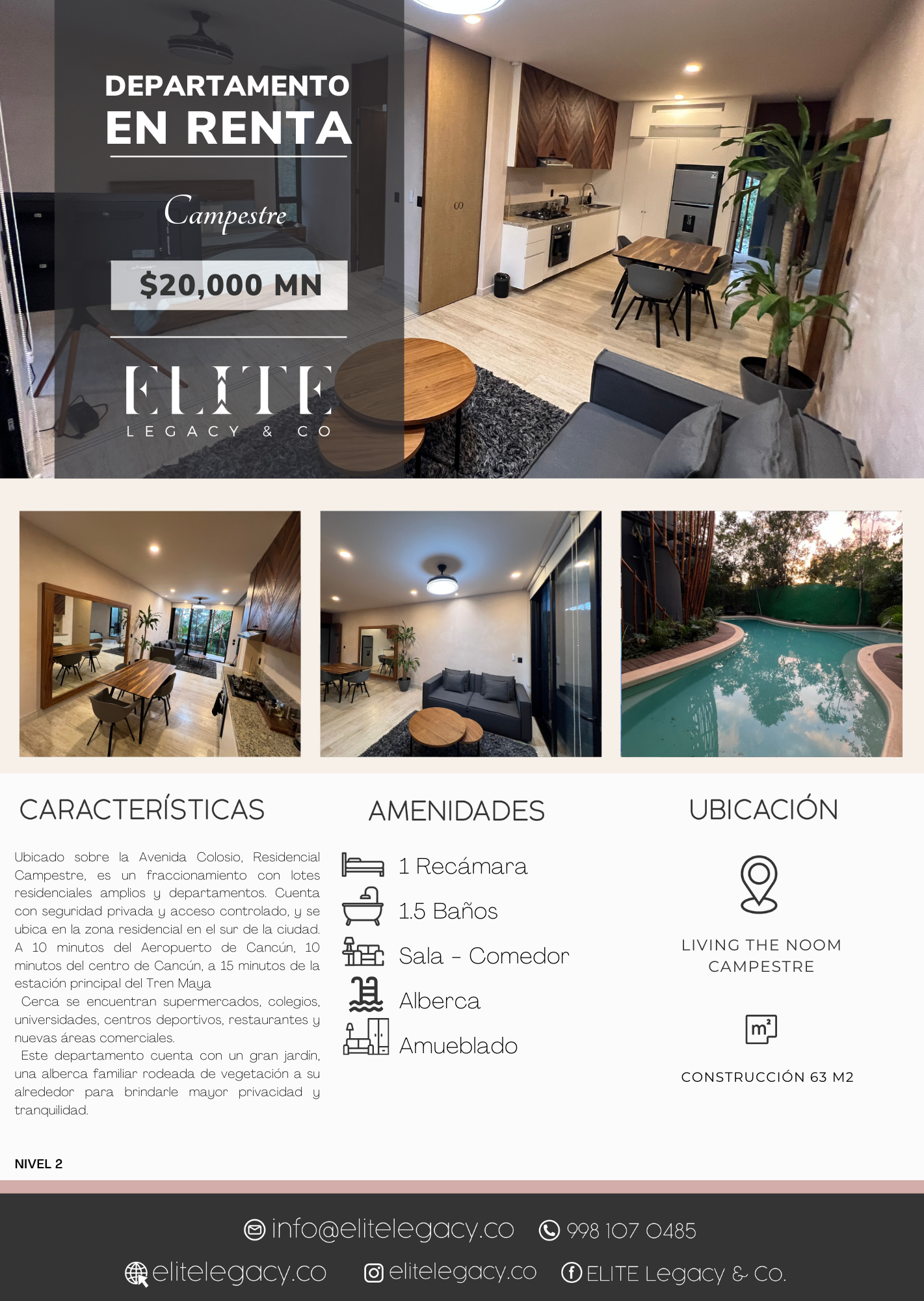 Este departamento cuenta con un gran jardín, una alberca familiar rodeada de vegetación a su alrededor para brindarle mayor privacidad y tranquilidad.