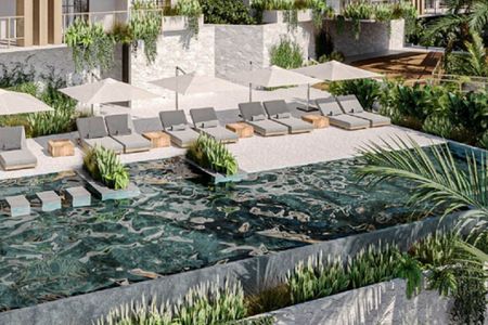 Condomínio perto da praia, terraço comum com vista para o mar, piscina e academia