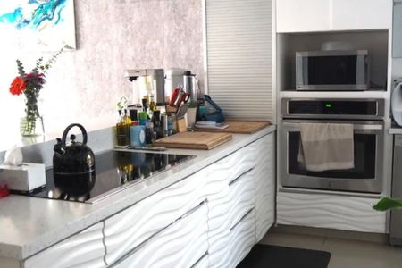 Teto alto, com cozinha, armários e janelas de vidro duplo