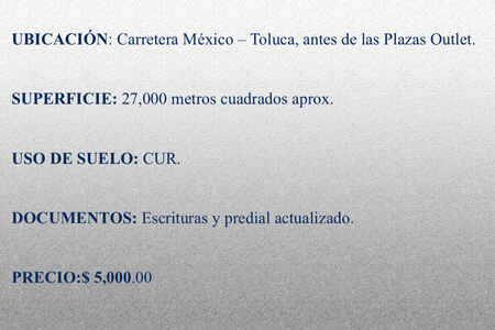 Venda-Aluguel de Terreno ao pé da Carretera Mex-Toluca Km 38