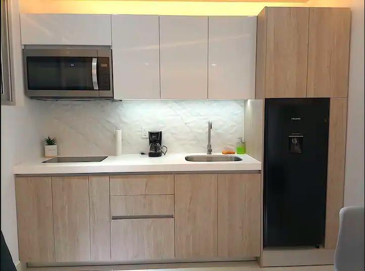 • Cocina tipo americana equipada con estufa, microondas, refrigerador y campana