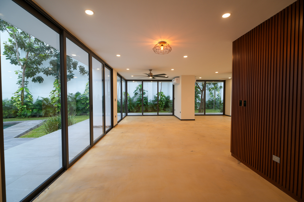 Sala y comedor con amplios ventanales y vistas a áreas verdes