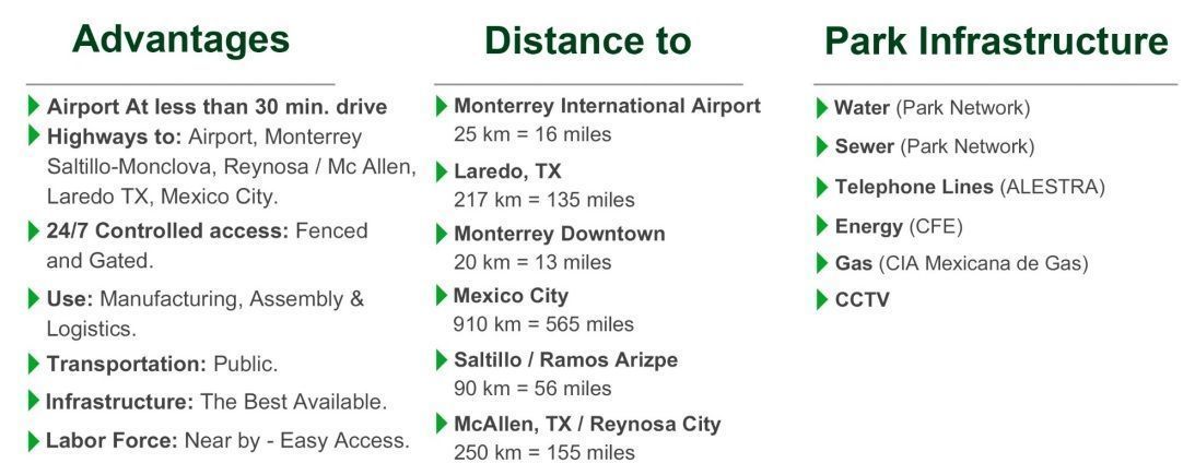 PARQUE INDUSTRIAL LOCALIZADO EM UM DOS MERCADOS MAIS IMPORTANTES DO NORTE DO MÉXICO. LOCALIZADO A MENOS DE 30 MINUTOS DO AEROPORTO. LEVA PARA AS ESTRADAS DO AEROPORTO, LAREDO TX, REYNOSA, MONTERREY, MC ALLEN, SALTILLO-MONCLOVA E CIDADE DO MÉXICO.