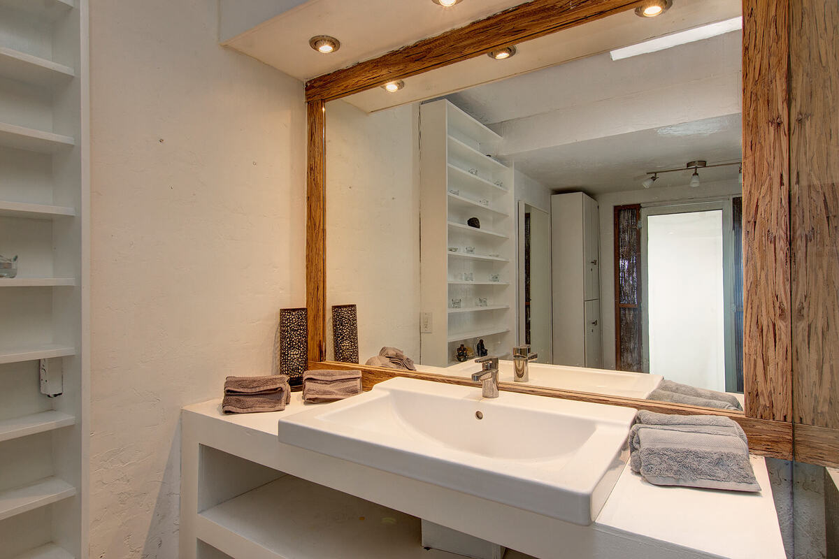 The principal bedroom offers bay-view windows facing the ocean, while the ensuite bathroom includes a glass shower, a unique vanity with a wood-framed mirror, and recessed lighting.