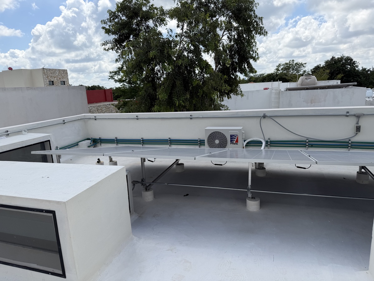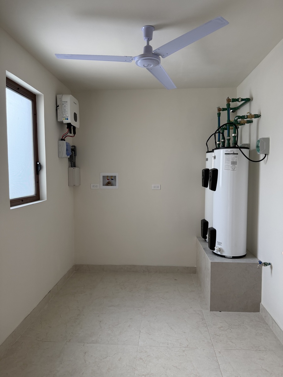 La casa cuenta con paneles solares, aires acondicionados, abanicos , pasto sintético.