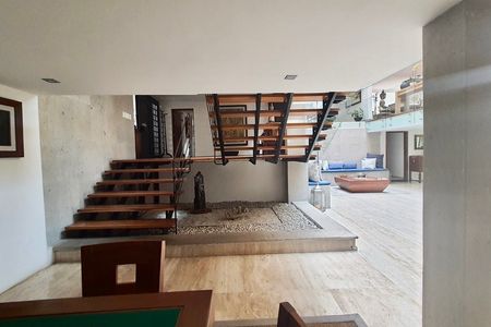 Térreo: Acesso externo, estacionamento para um carro descoberto e para dois carros cobertos, jardim frontal, terraço com cobertura de vidro, despensa, acesso interno, vestíbulo, sala de estar com lareira, escadas, sala de piano, sala de jantar, cozinha com área de lavanderia e despensa, sala de estar com lareira, lavabo, jardim, pátio posterior, escadas externas e quarto com banheiro completo.