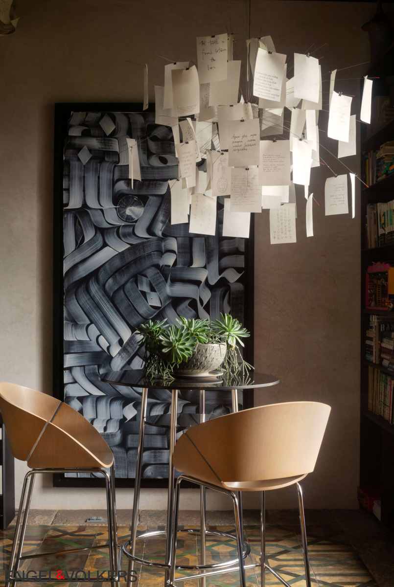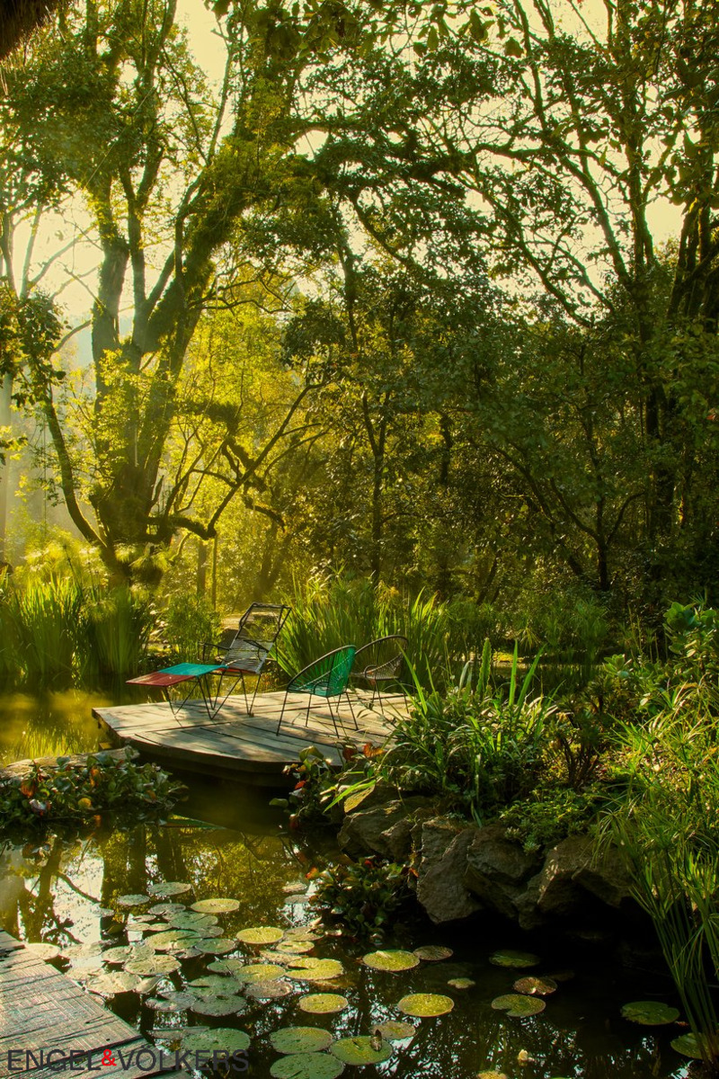 Cinco casas independentes e um estúdio se desdobram como pavilhões na floresta, conectados por caminhos que levam a jardins florestais, uma lagoa íntima com palapa e jacuzzi, e áreas comuns concebidas para a contemplação. Tudo nela respira história e ofício: paredes revestidas com estuques ancestrais, rebocos naturais de terra, dormentes resgatados da primeira linha do metrô da capital de 1968 e pedra de canteiro centenária proveniente do coração de Puebla. Pisos e paredes exibem mosaicos projetados por artistas renomados, enquanto um mural intervenido por Ricardo Ángeles, de Oaxaca, transforma a residência em um verdadeiro espaço de arte viva.