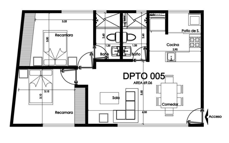 El departamento se encuentra en la planta baja, 69.00 m2 de construcción, muy iluminado, amplio espacio en sala comedor, cocina abierta, patio de servicio, 2 recamaras, 2 baños (uno de ellos dentro de la recamara principal), 1 estacionamiento, 1 bodega, 1 elevador con servicio desde el nivel del estacionamiento, vigilancia las 24 horas.