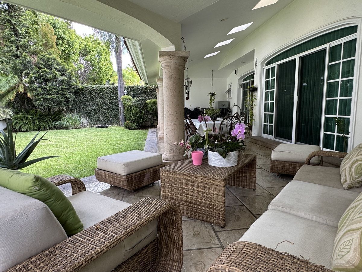Terraza techada muy amplia, con jardín y fuente.