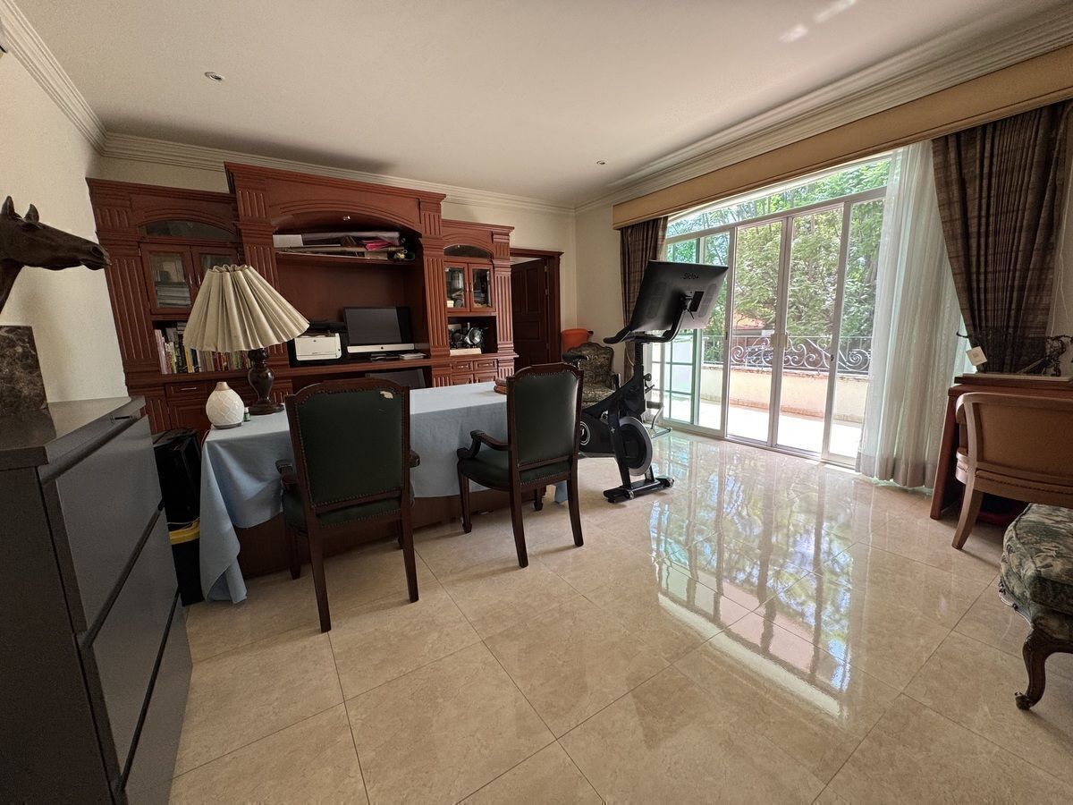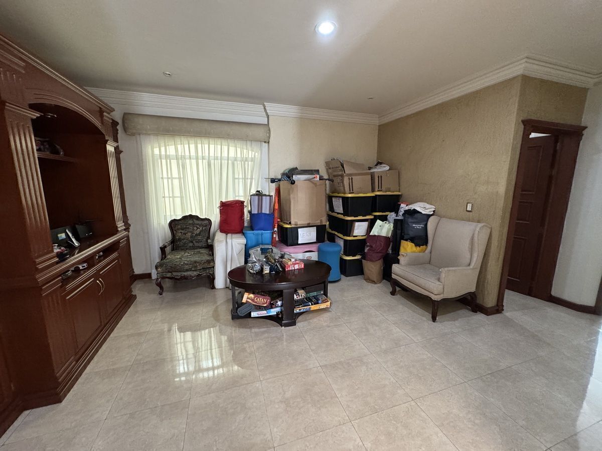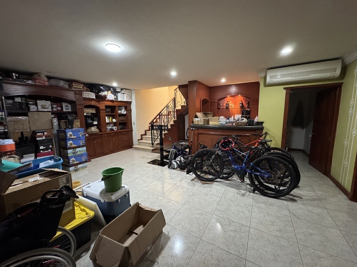 Estudio amplio con baño completo en planta baja. Estar de TV en planta alta. Sala de juego grande en sótano con bar y medio baño.