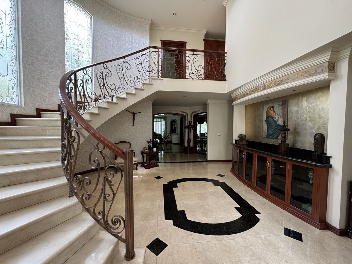 Entrada o recibidor de doble-altura con escalera circular y vitrales. Acabados de lujo (mármoles, cuarzo, maderas, piedra, etc). Armarios empotrados de calidad.
