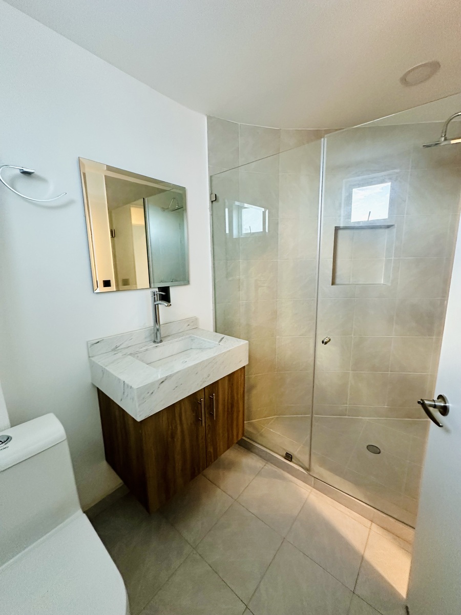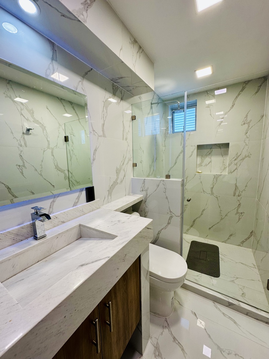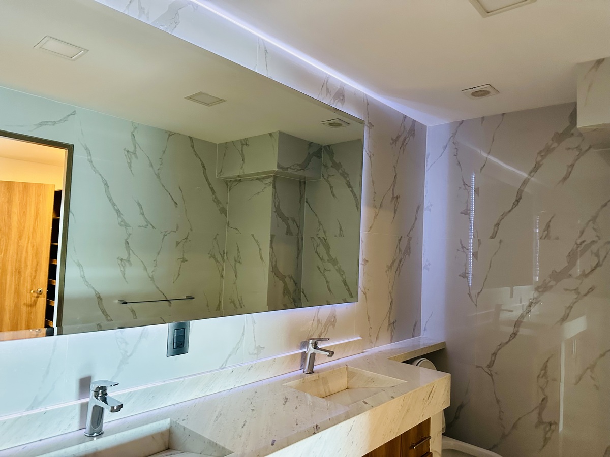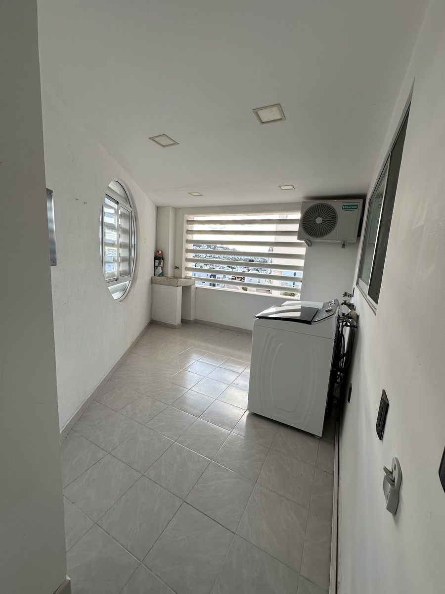 Amplia sala-comedor con terraza ideal para disfrutar los atardeceres, cocina equipada con cubiertas de granito Calacatta, refrigerador, lavavajillas, horno, microondas, aire acondicionado, lavadora y secadora.