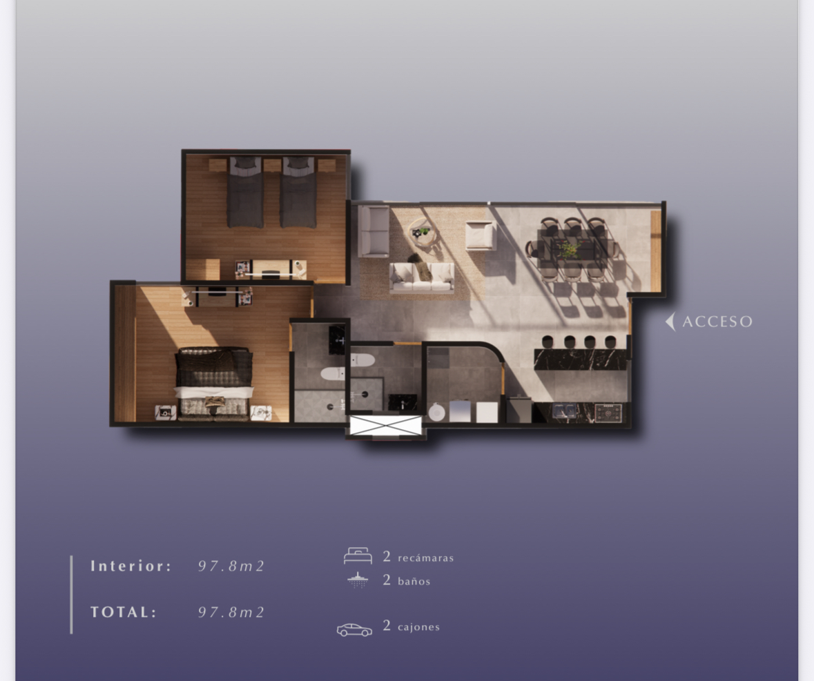 Exclusivo de departamento en Fracc. con acceso controlado y vigilancia las 24hrs. Dispone de Sala, Comedor, Cocina equipada, 2 recámaras, 2 baños completos, Cuarto de Lavado, 2 cajones
