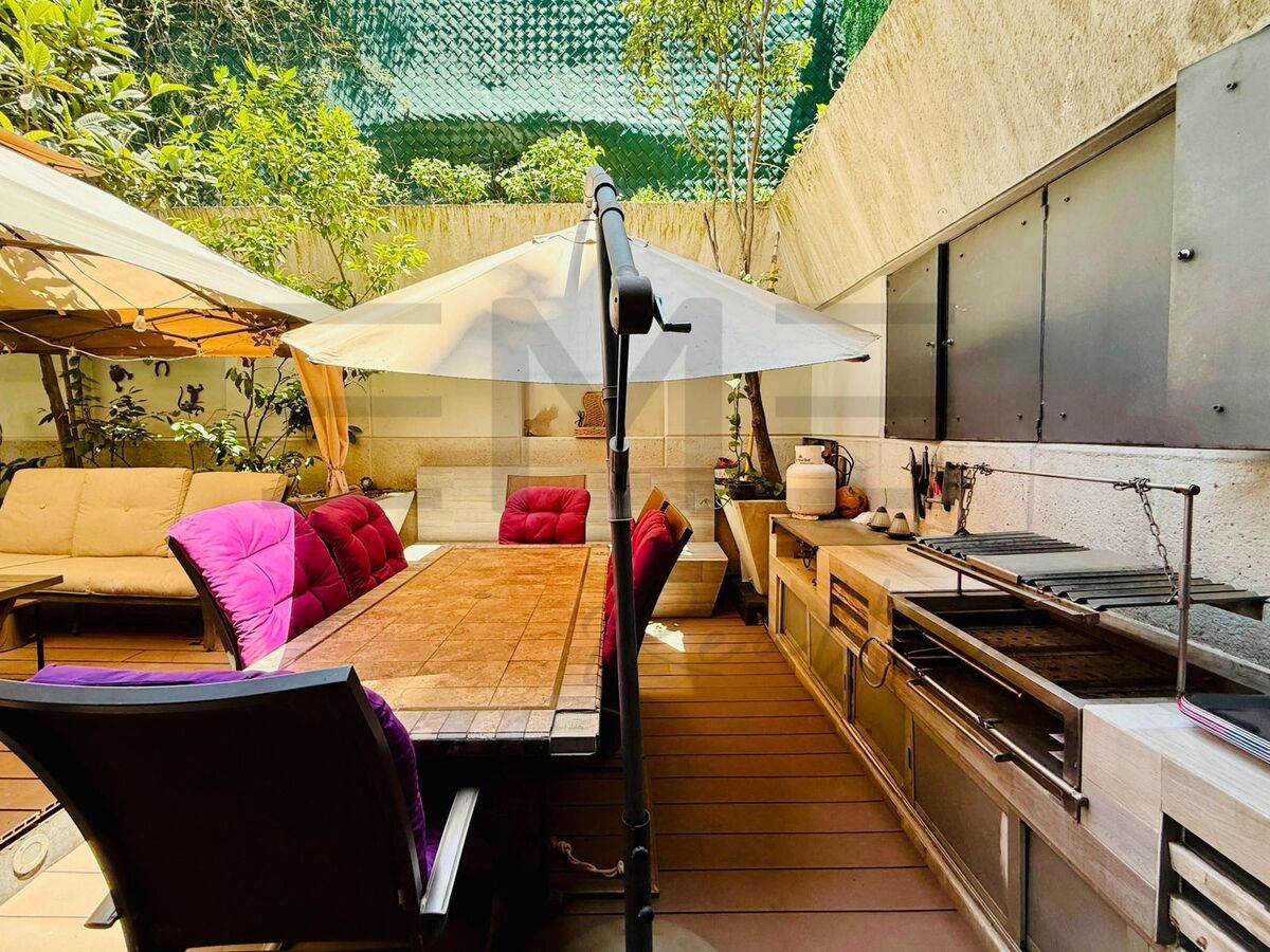 - 60 m2 de terraza y jardín con plancha para asados, parrilla tepanyaki y fuente tipo muro llorón.