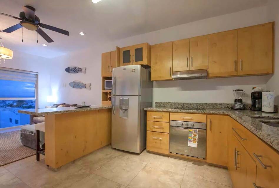 Nuestra cocina de concepto abierto está diseñada para que disfrutes de tus comidas y de la compañía sin perderte ni un momento de la conversación. Cuenta con gabinetes de madera clara que maximizan el espacio y todos los electrodomésticos esenciales en acero inoxidable: refrigerador de buen tamaño, microondas y cafetera. Prepara desde un café rápido hasta una cena completa con facilidad. Botellero integrado sobre el microondas, perfecto para almacenar vino o licores.