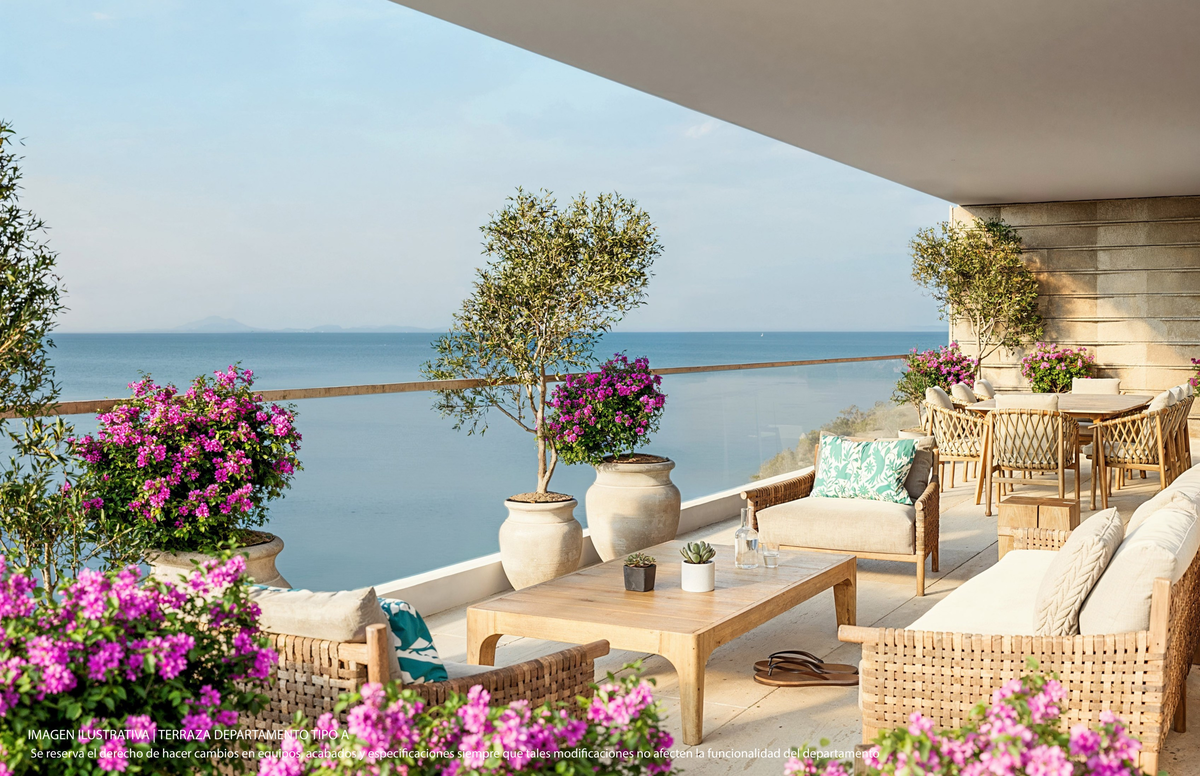Explora estos departamentos de una, dos o tres recámaras. Todos ellos cuentan con vista al mar desde todos los espacios: recámara, sala, comedor y cocina integral.