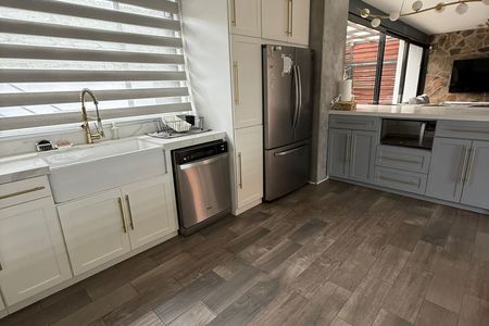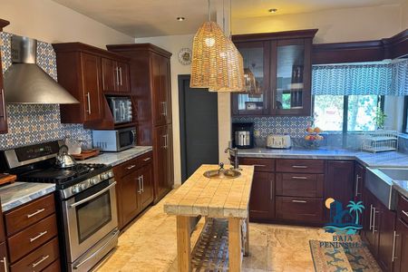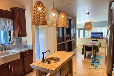 Comedor, estancia grande con sala y chimenea, cocina integral, cuarto lavar, 3 recamaras con mini split, 2 baños completos, 1/2 baño visitas terraza-Deck 3.5 m x 16 m, con vista espectacular a valle y viñedos.