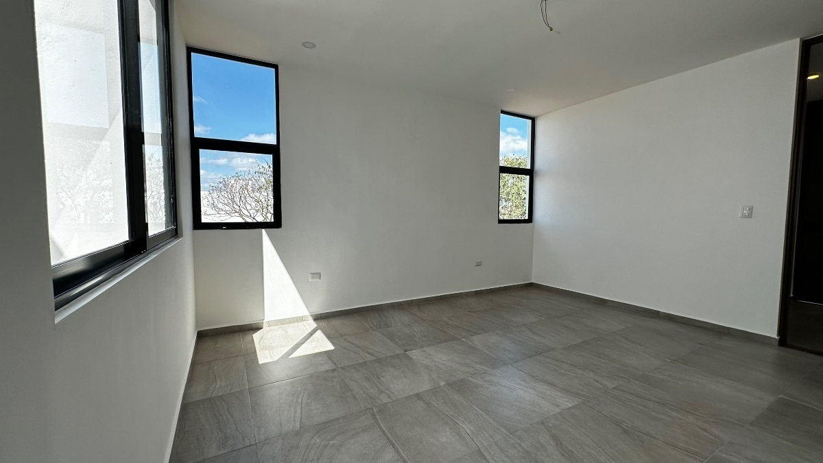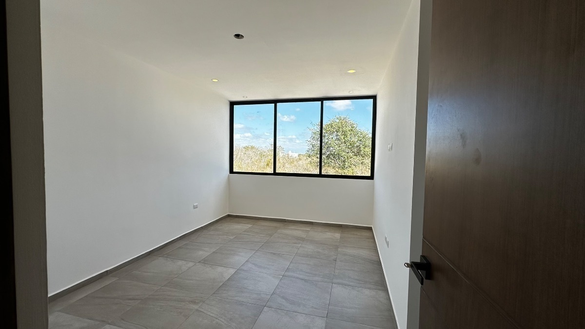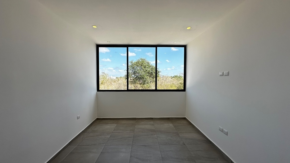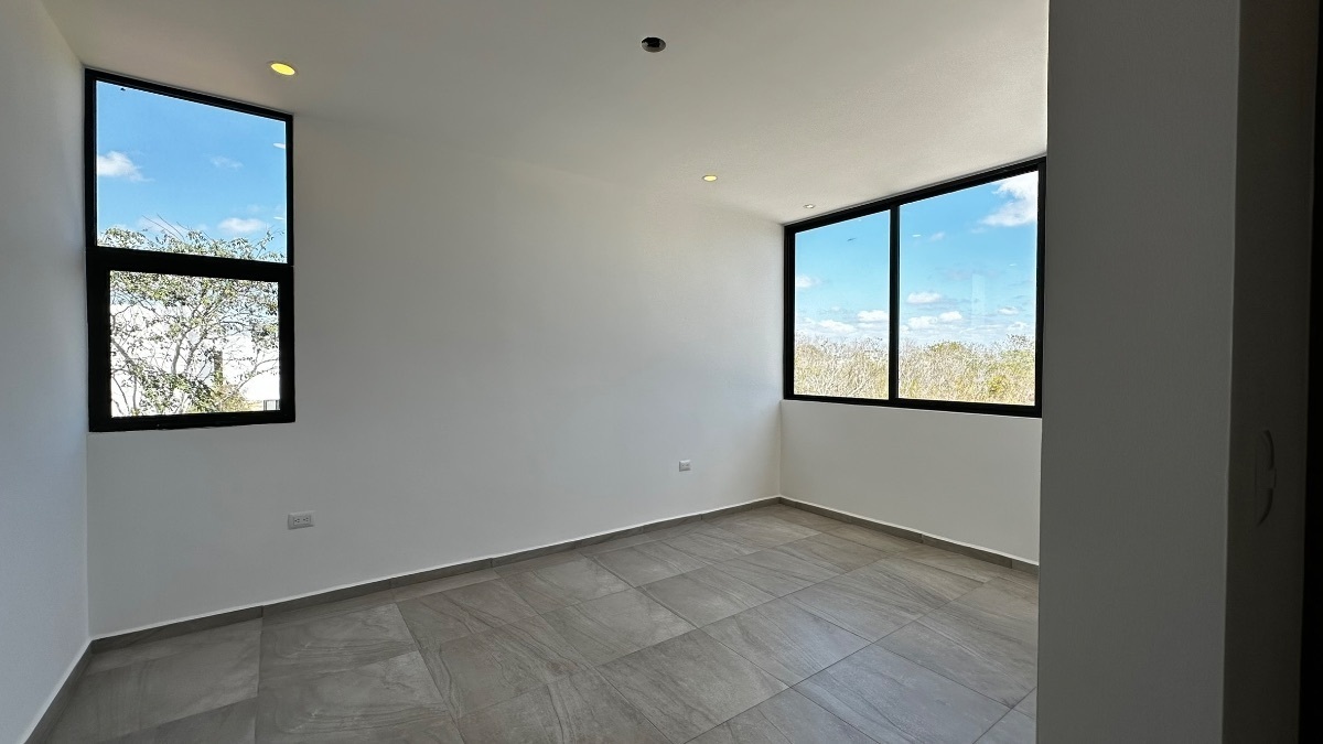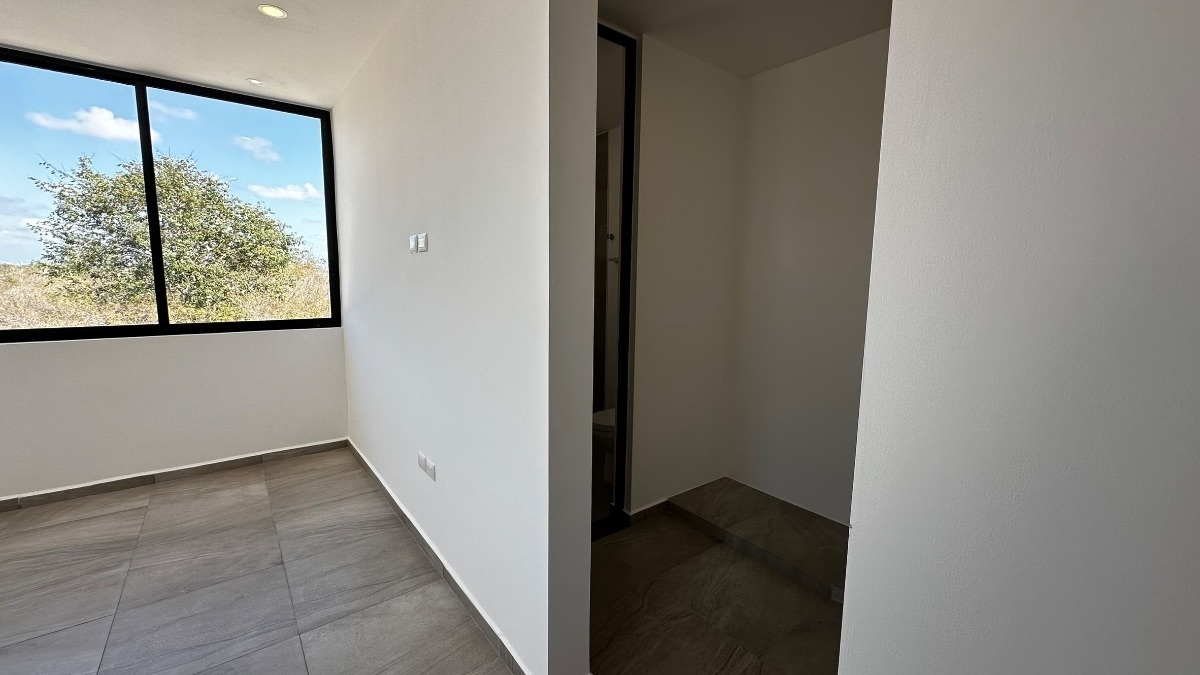 Habitación secundaria con clóset vestidor y baño completo, vista al jardín.