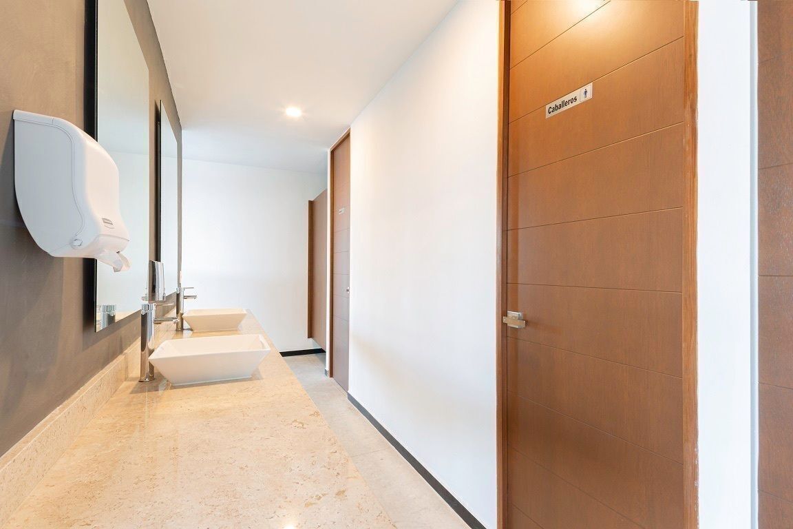 Bancadas de mármore nos banheiros com pia de porcelana sobre a bancada e móveis de madeira.