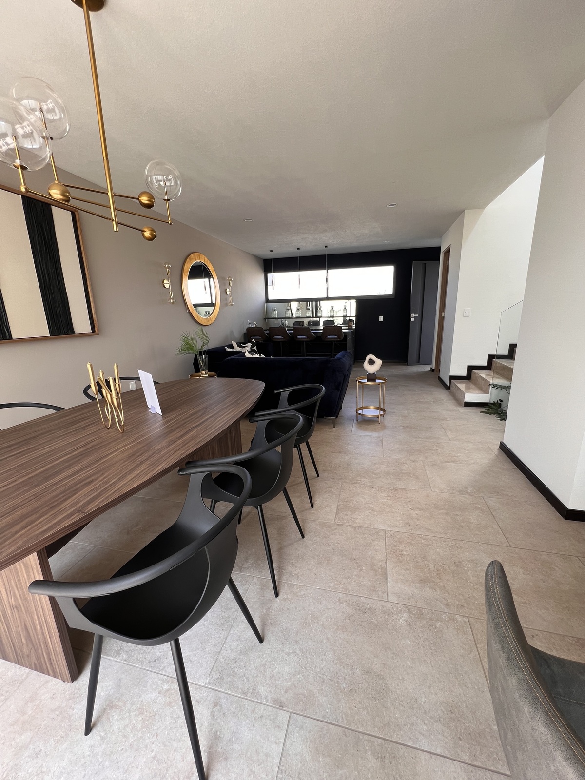 Un jardín de buen tañaño y sala comedor espaciosa, además de su cocina integral equipada.