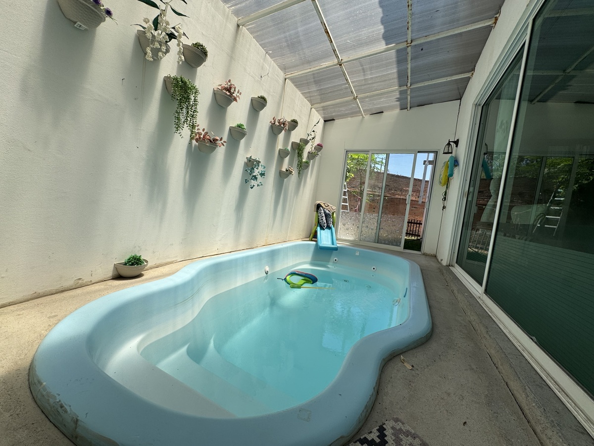 - Nos fundos, há uma piscina coberta, uma palapa com churrasqueira e árvores frutais.