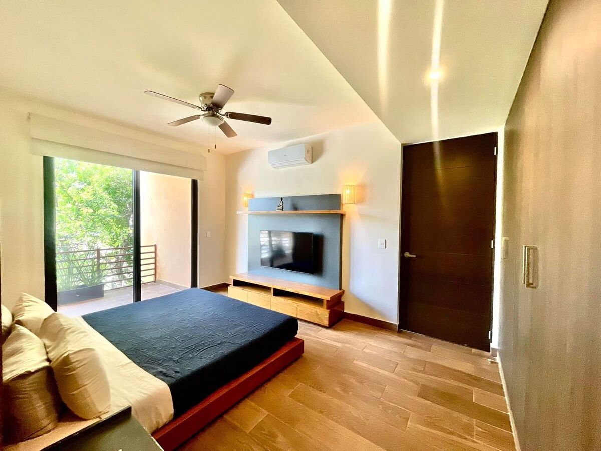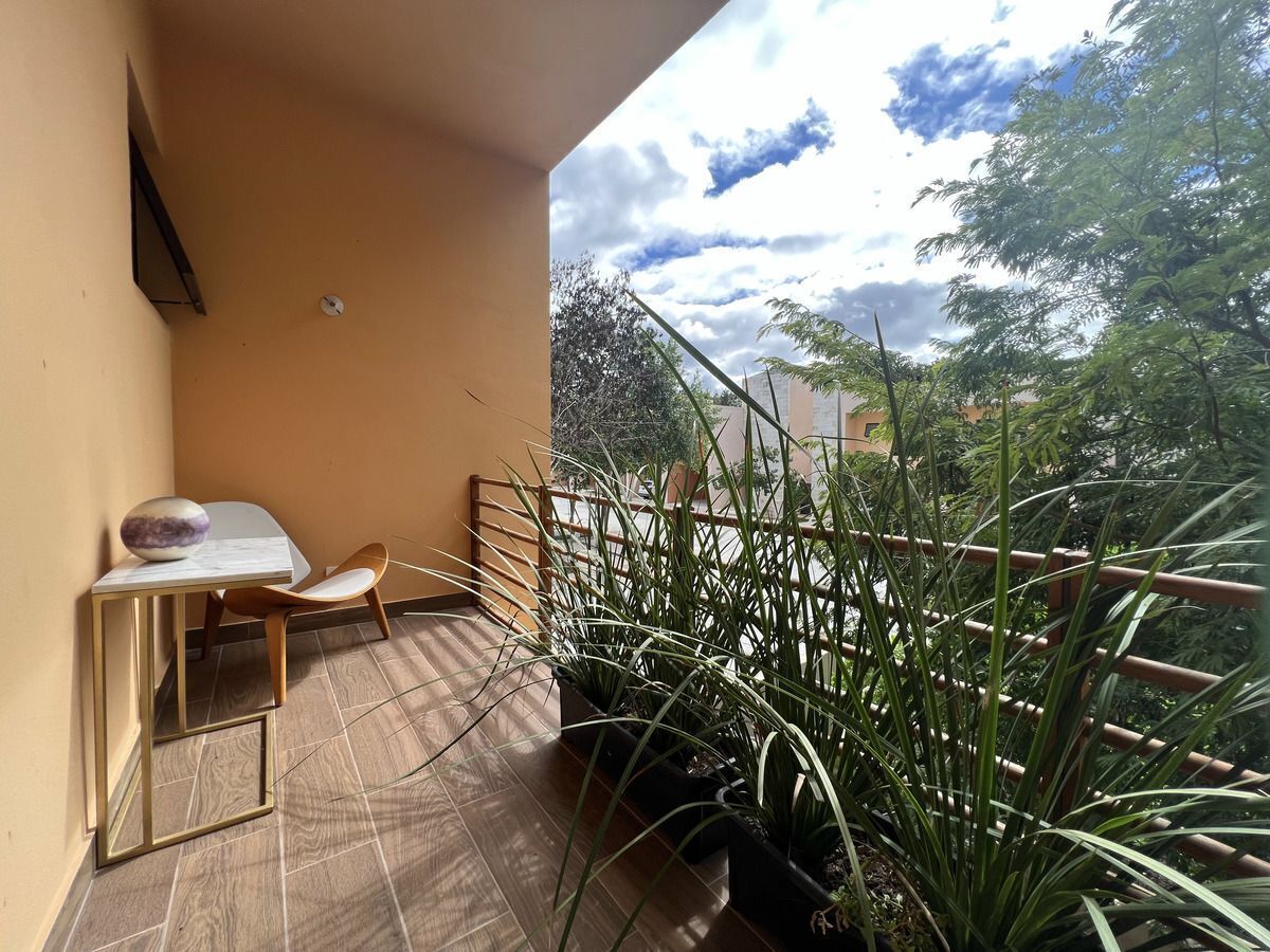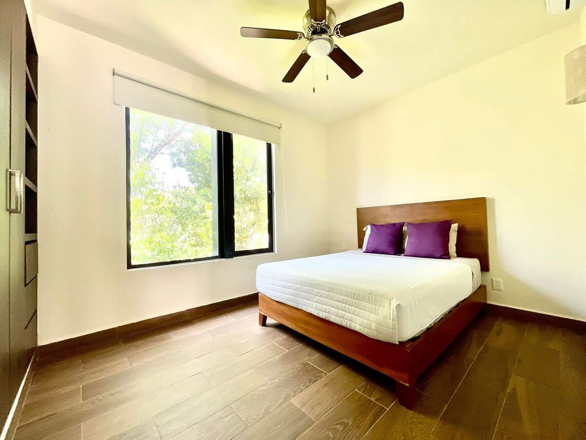 - Master bedroom with closet, bathroom, and terrace overlooking the green areas.