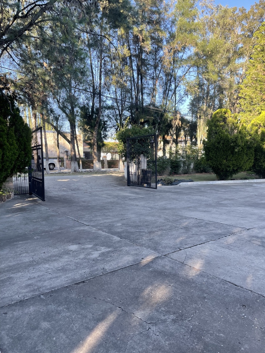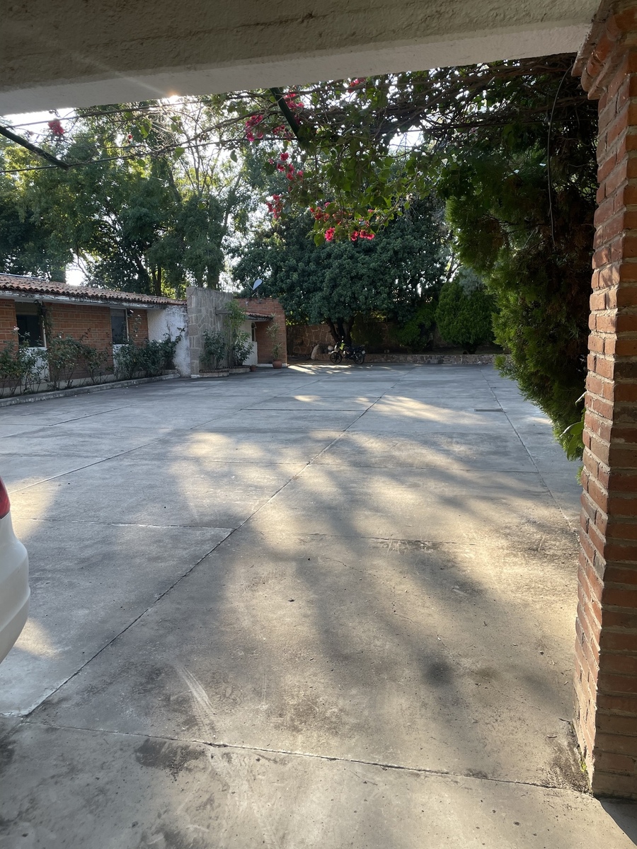 En el frente de la casa hay un jardín con hermosos árboles inmensos que adornan tanto la casa como la calle principal del fraccionamiento y tiene una cochera para dos autos grandes además del patio donde pueden estacionarse más de 6 autos.