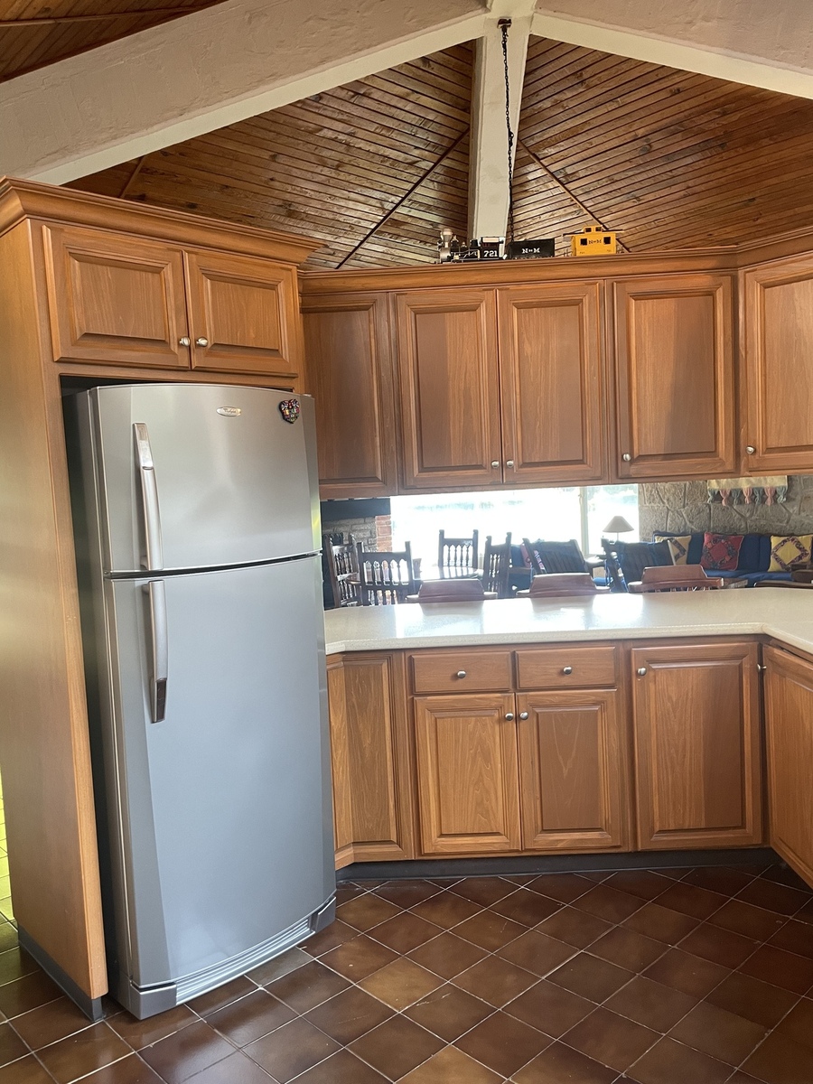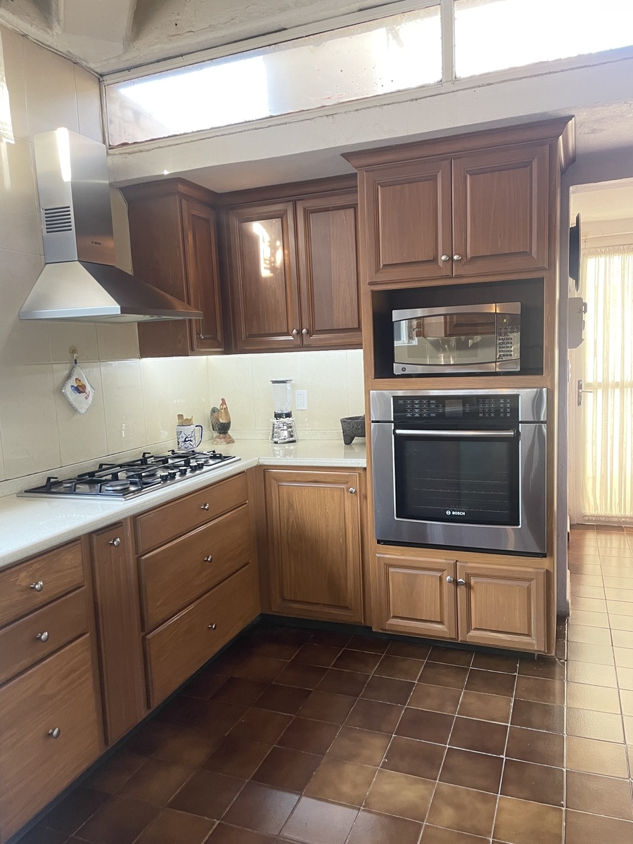 La sala se comunica con la terraza que da al jardín principal y tiene una hermosa chimenea y el comedor está comunicado con la cocina que tiene una barra como desayunador, un medio baño y acceso al cuarto de lavado.