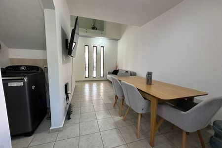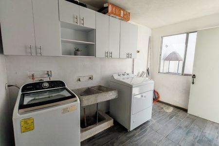 Lavanderia coberta com máquina de lavar, secadora, aquecedor e caixa d'água