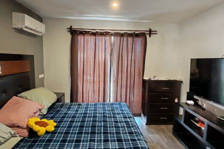 La recámara principal cuenta con baño completo, cama matrimonial, pantalla con ROKU TV, clima y un abanico de techo.
