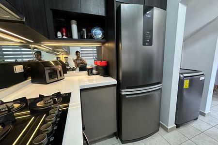 Cozinha equipada com fogão, geladeira, micro-ondas, louças e cafeteira