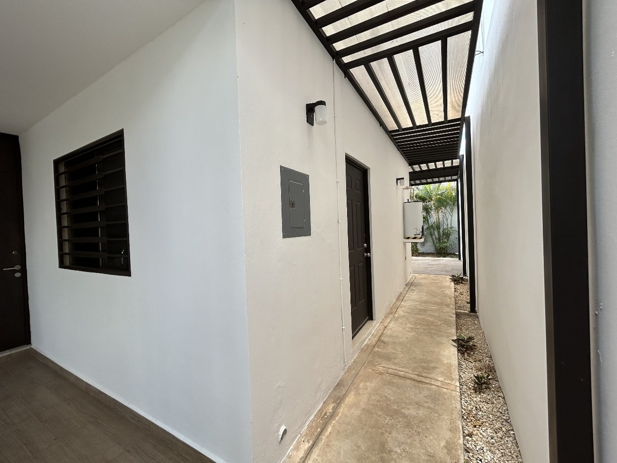 โ—ฝ Pasillo lateral techado con estructura metรกlica y policarbonato.